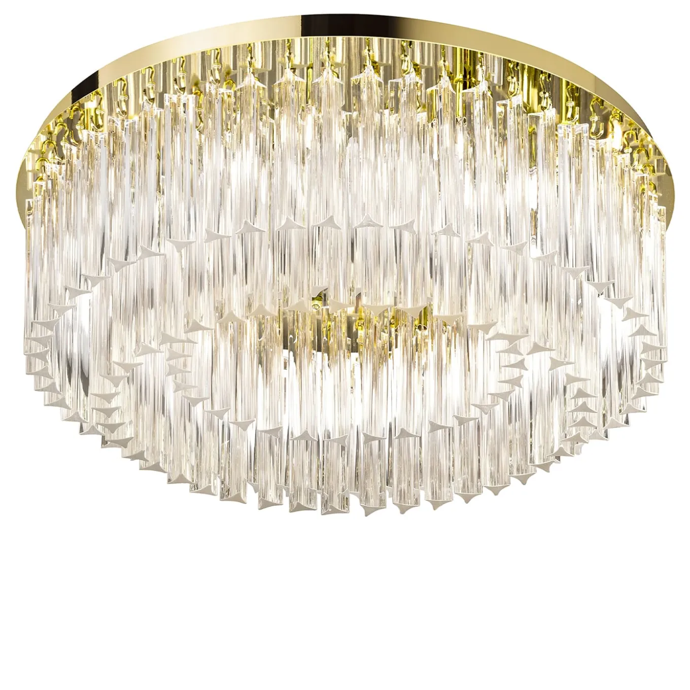 This marvelous chandelier playfully inspired by donuts is sure to uplift any modern setting with its outstanding opulent character. A crowded spiral of trihedron pendants in clear glass descends from a glistening brass disk, the eighteen G9 bulbs having their light flow interacting with the metal and glass surfaces for a breath-taking interplay of reflections and refractions of high decorative flair.