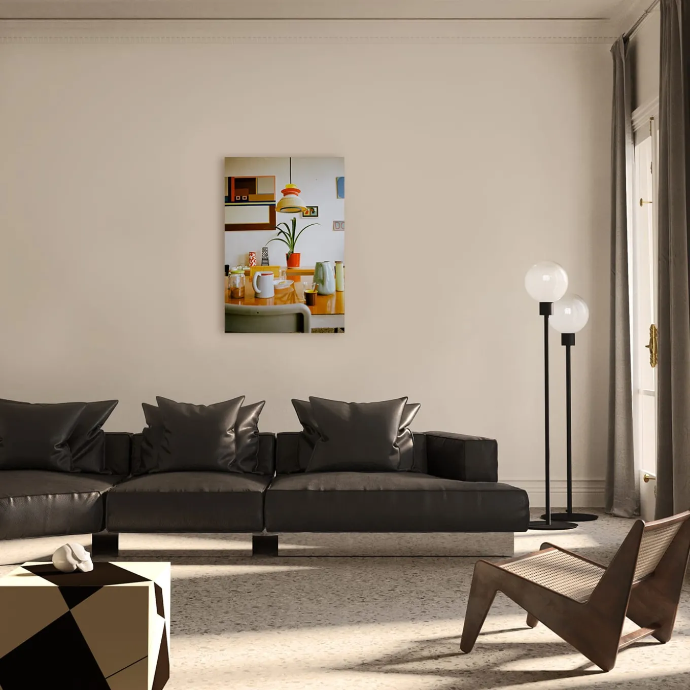 The 2019 photograph of a vintage-inspired dining room with jars, pitchers, and coffee leftovers on the table adding to artworks by Natalie Du Pasquier decorating walls is pressed on this fine, matte-finished C-type print. A master pressman takes care of the entire analogical printing process on Fujicolor Crystal Archive Professional Paper – Maxima under the artist’s supervision. This is a limited edition of n. 5. Frame not included.