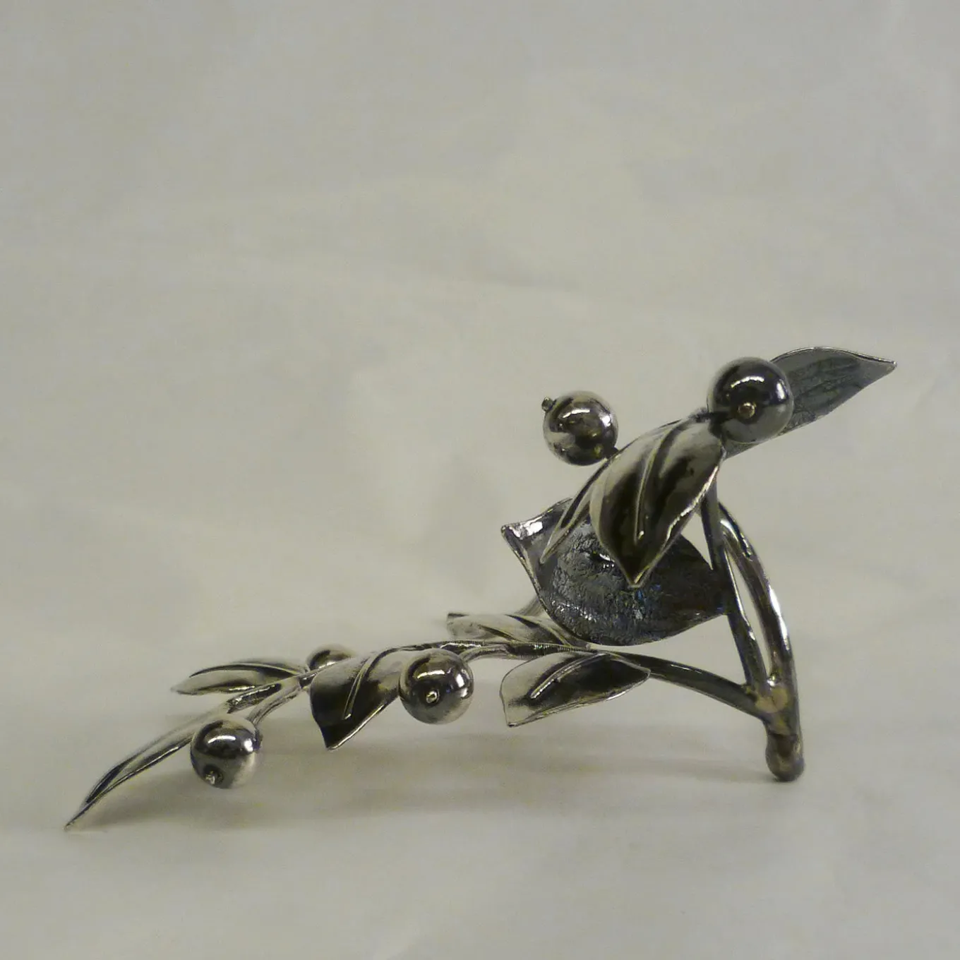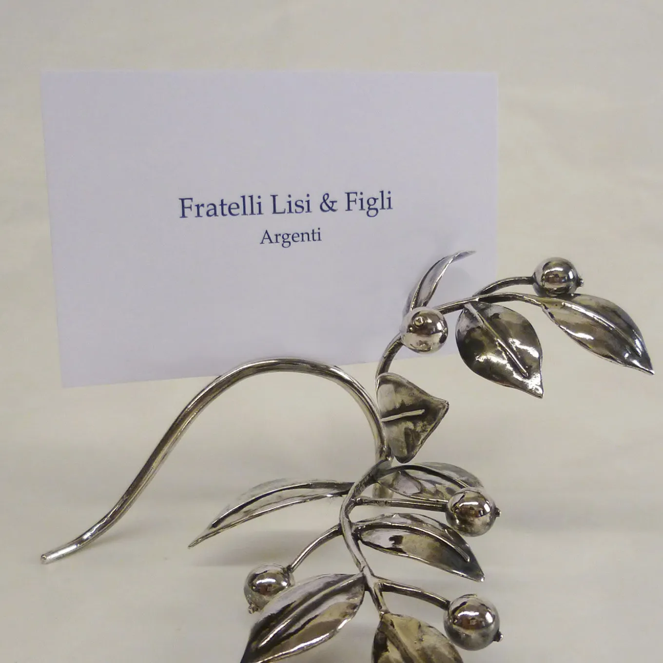 Made of silver and boasting exquisite craftsmanship, this stunning object of functional decor will add a delicate holiday touch to an elegant dinner table. Shaped as a double mistletoe branch, this piece will create a subtle decoration, while also being able to make room for a small place card, thanks to a small cut at the base. The splendidly rendered leaves curve in a dynamic composition, dotted with the signature round berries.