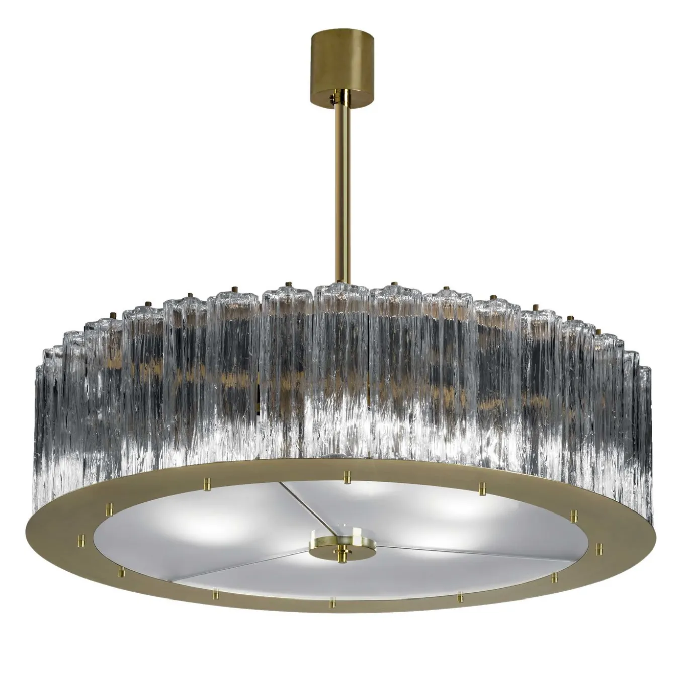 A stunning interpretation of Art Deco elegance, this chandelier is part of the Home Couture Collection. It creates a superb effect both when lit, shining the light of its six bulbs, and when not on, thanks to its superb sculptural shape. The glass elements that run around its circular frame in metal with a brass finish refracts the light for a mesmerizing effect, while the glass bottom diffuses it below.