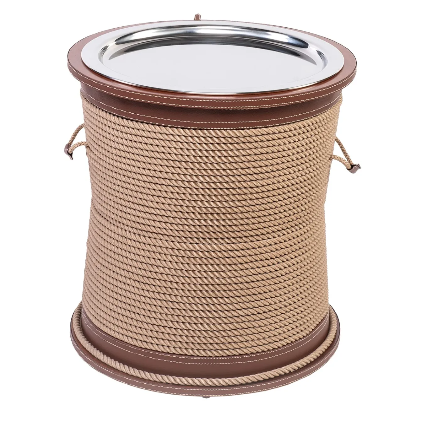 This exclusive design rich in luxe tailored details and brimming with nautical flair will serve as an elegant backdrop for aperitifs to be enjoyed in cockpit areas. Designed to maximize functionality in a compact shape, the piece features a drum-like wooden silhouette covered in beige leather and extensively covered with rows of nautical ropes, also used for the practical side handles. The round steel tray can be lifted to store bottles and glasses.