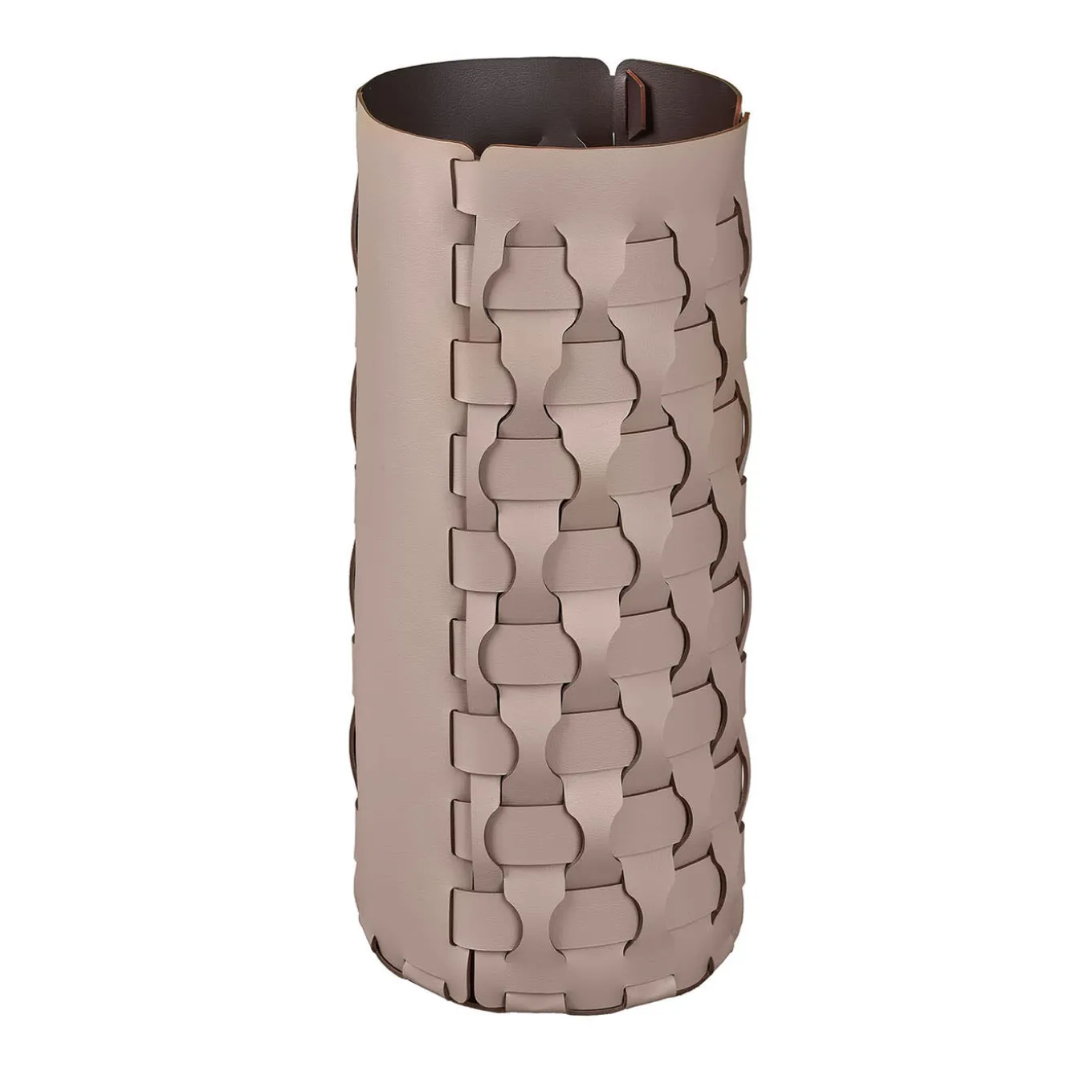 An elegant and practical umbrella stand crafted from high-quality leather, designed to be impervious to moisture and dirt. This essential household item helps maintain a clean and tidy home. Inside, it features a durable acrylic glass bucket for added convenience. The cappuccino and chocolate umbrella stand is a stylish addition to any entryway or hallway.