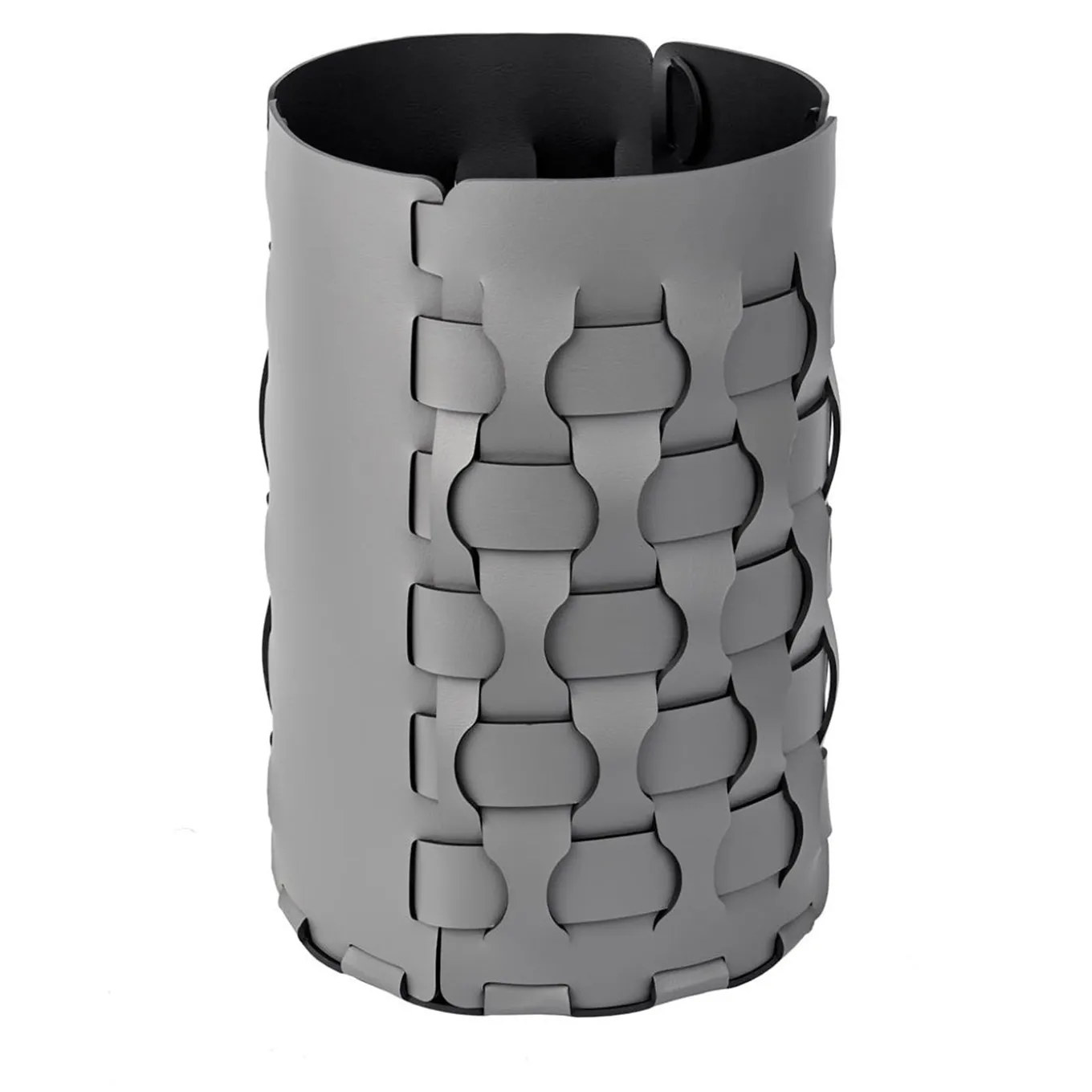 This waste basket features a distinctive interwoven design in grey and black leather, offering a refined and contemporary accent to any office or home setting. It includes a practical acrylic glass bucket inside for easy waste disposal and cleaning. The medium size enhances its versatility, while the sleek color combination adds a subtle touch of sophistication to complement various decor styles. Designed by Ekaterina Borovkova.