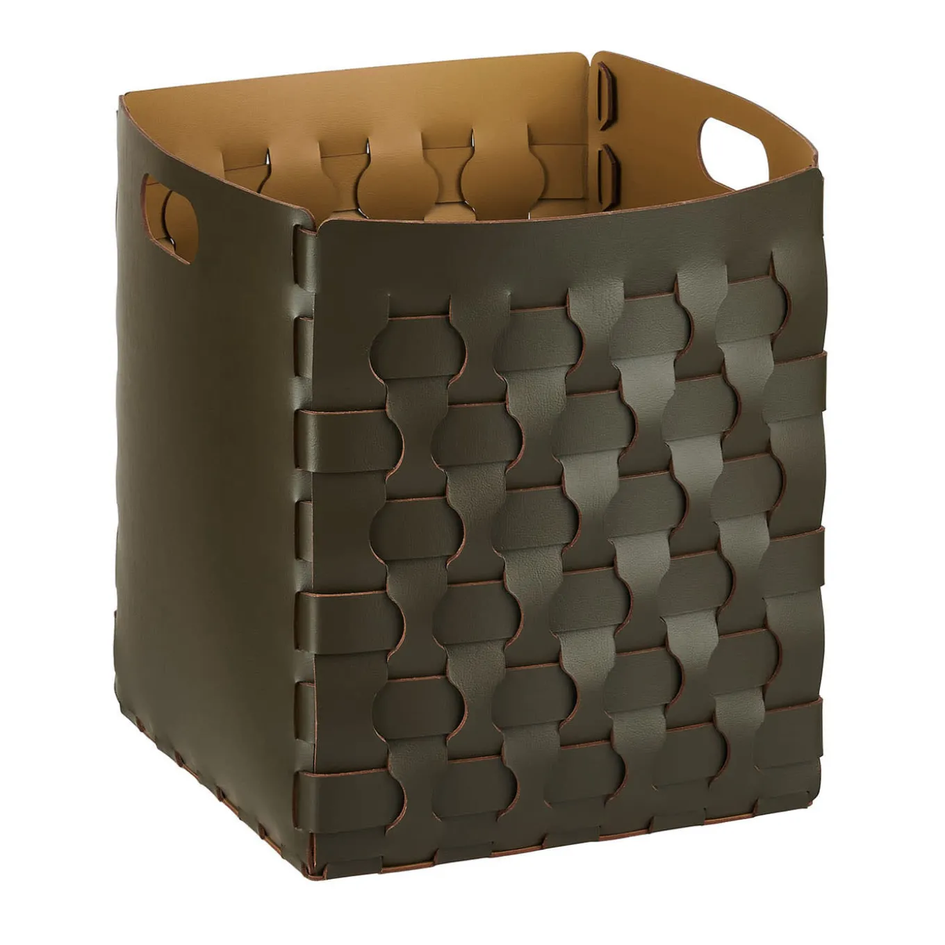 This woven basket, designed by Ekaterina Borovkova, features a unique wave pattern crafted from chunky wicker. It offers stylish storage for everyday essentials. The mix of squares and rectangles adds a touch of modern design, while the olive and mustard colorway provides a warm, neutral tone. Perfect for storing linens, slippers, blankets, toys, or even sports equipment, it seamlessly integrates with your existing décor.