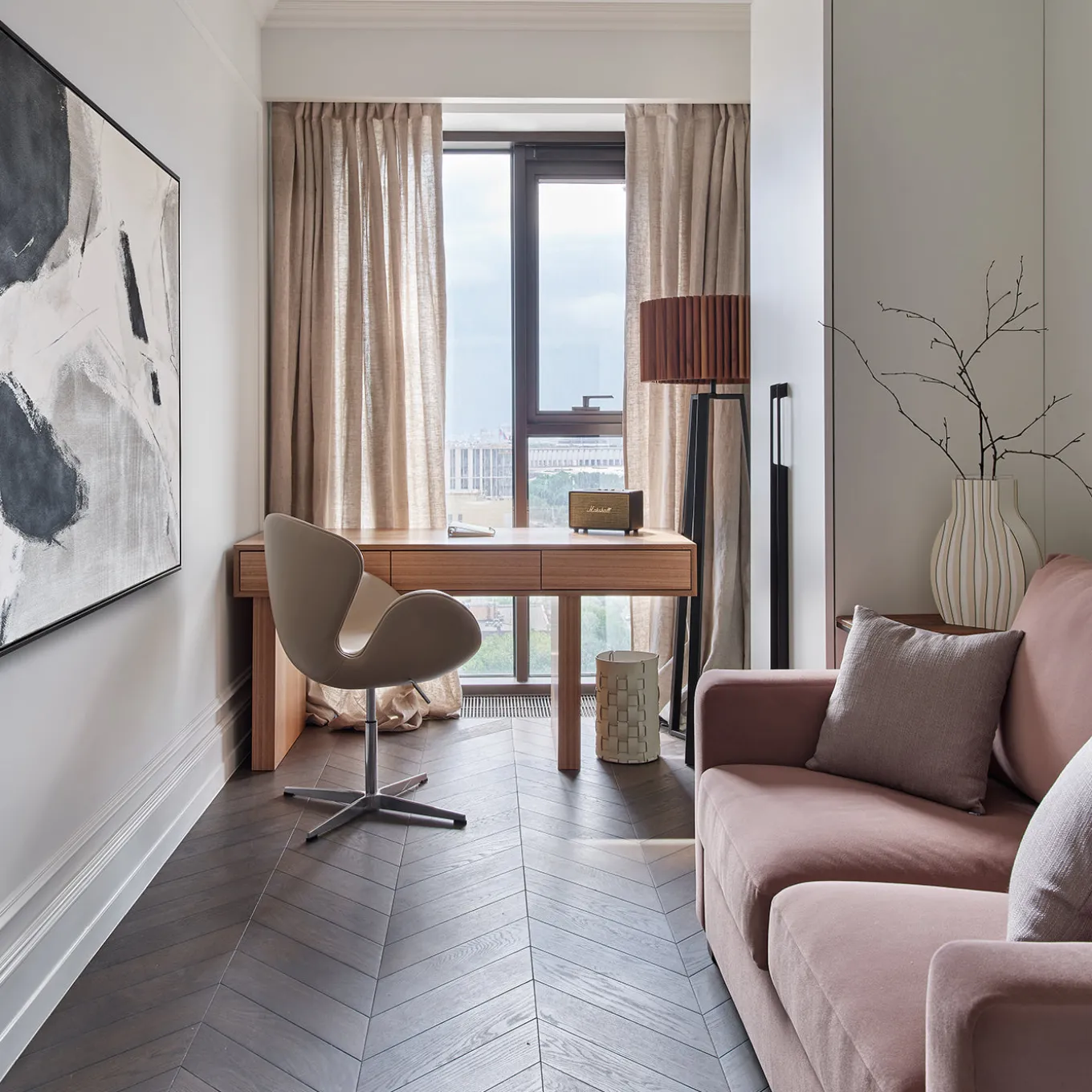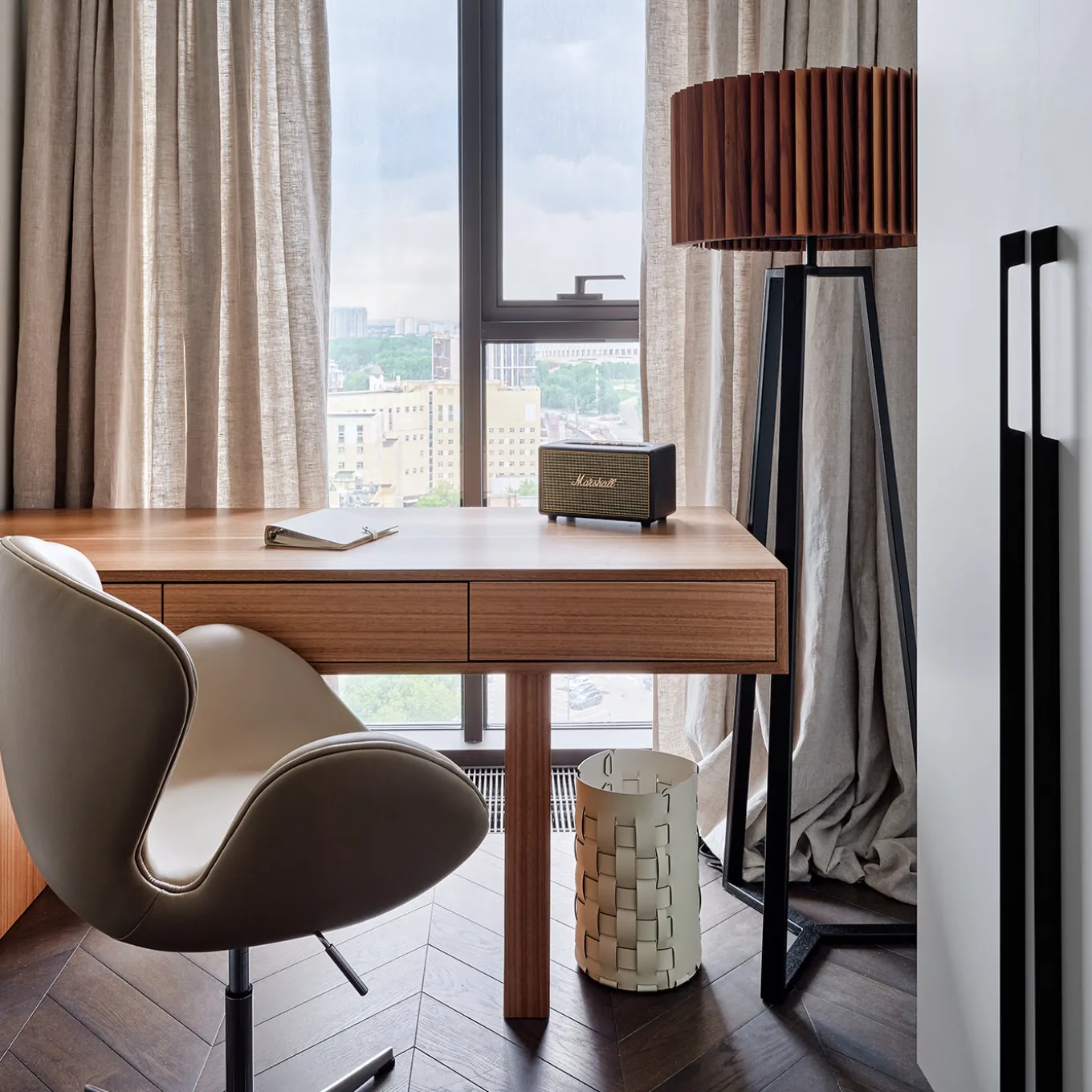 This leather waste basket features an intricate woven design in oyster and ash rose tones, adding a refined element to any office or home setting. It discreetly contains waste within an acrylic glass inner bucket, combining practicality with elegance. Designed by Ekaterina Borovkova, the basket elevates desk accessories with its sophisticated color scheme and innovative structure.