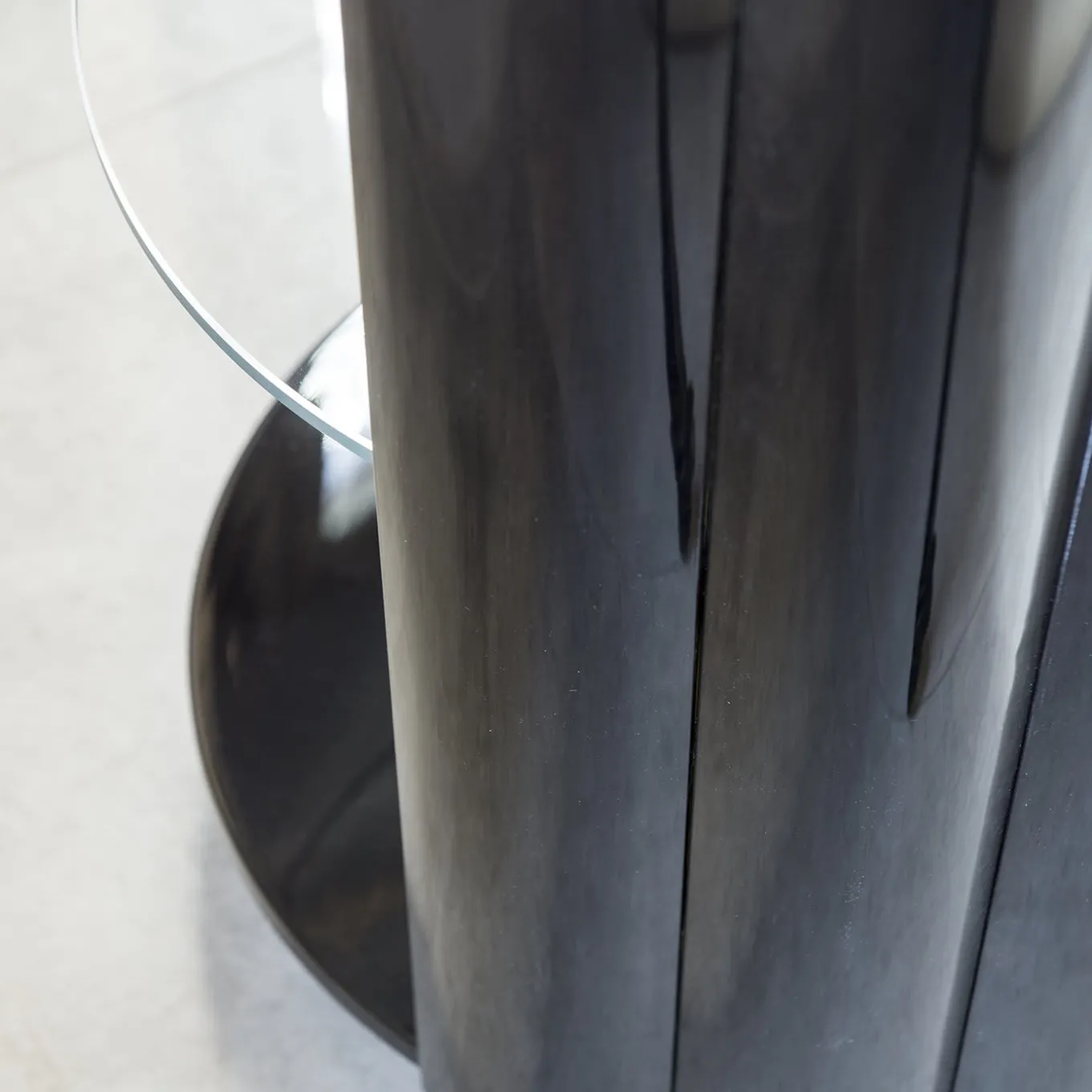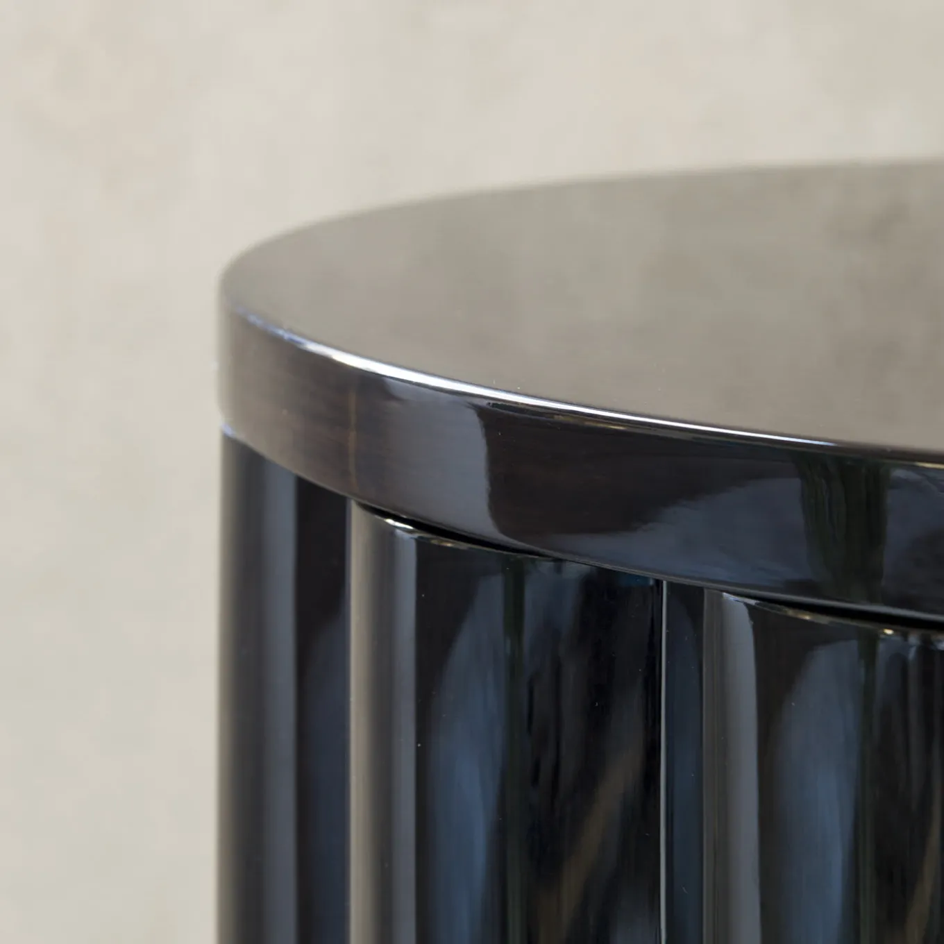 Ribbed drinks cabinet with round top and two sides, 1 glass shelf and hidden casters. Ash wood. Finish: glossy dark oak. Designer: Isabella Costantini.