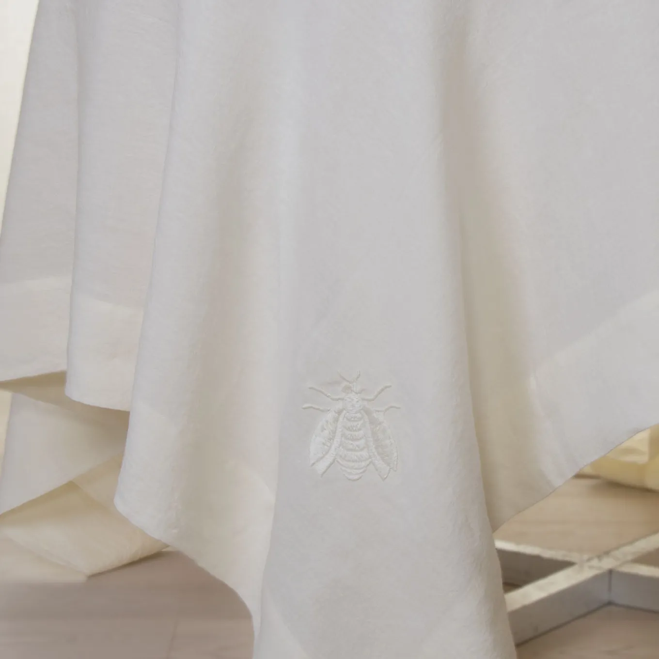The Dunans III tablecloth is crafted from pure linen and features an exquisite large bee embroidery delicately positioned on each corner. A refined expression of artisanal elegance, it brings timeless charm and sophistication to any table setting.
