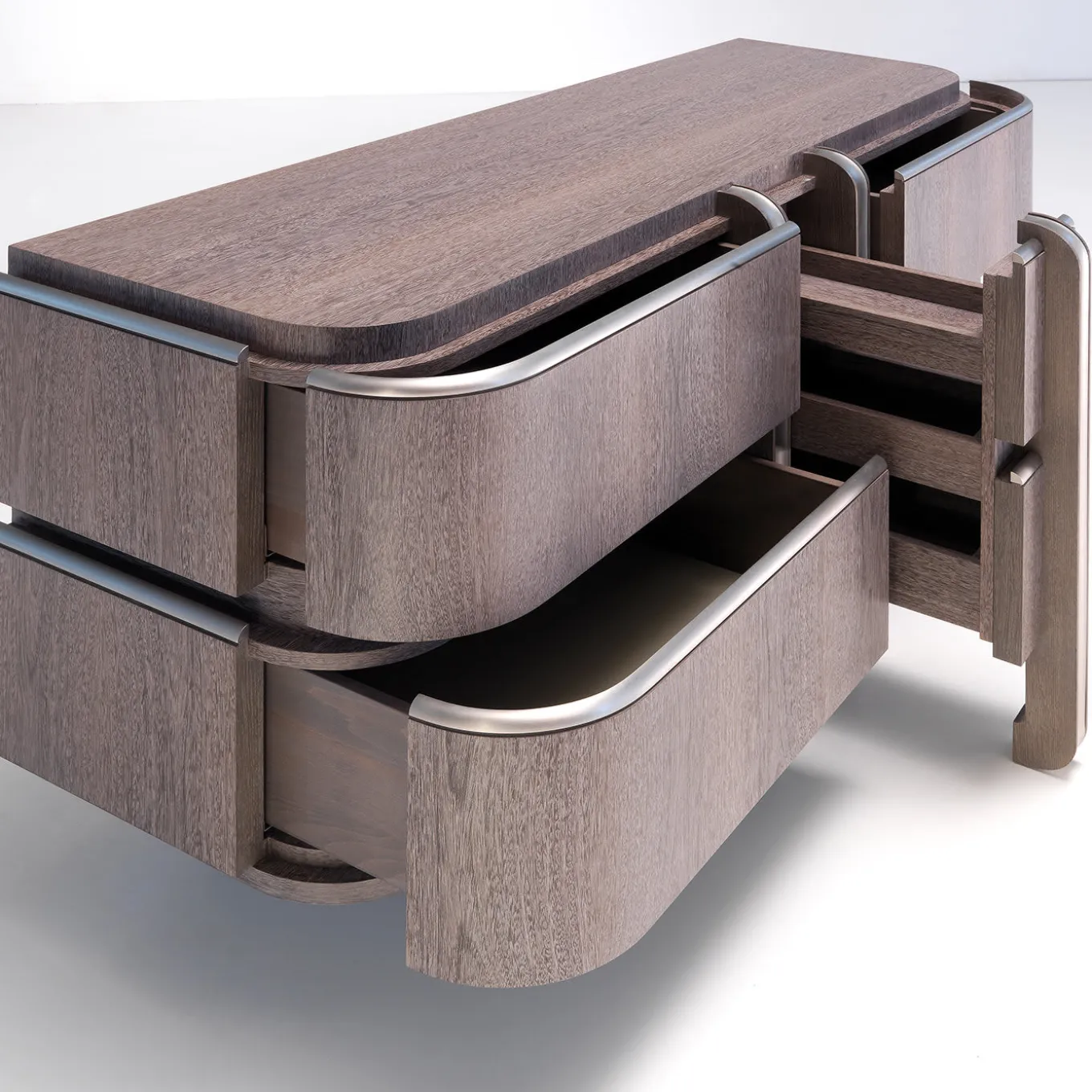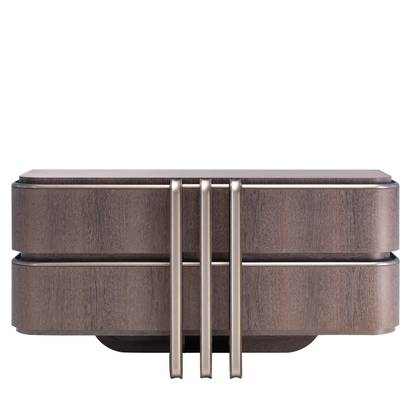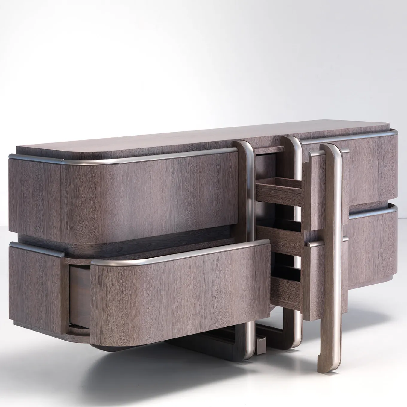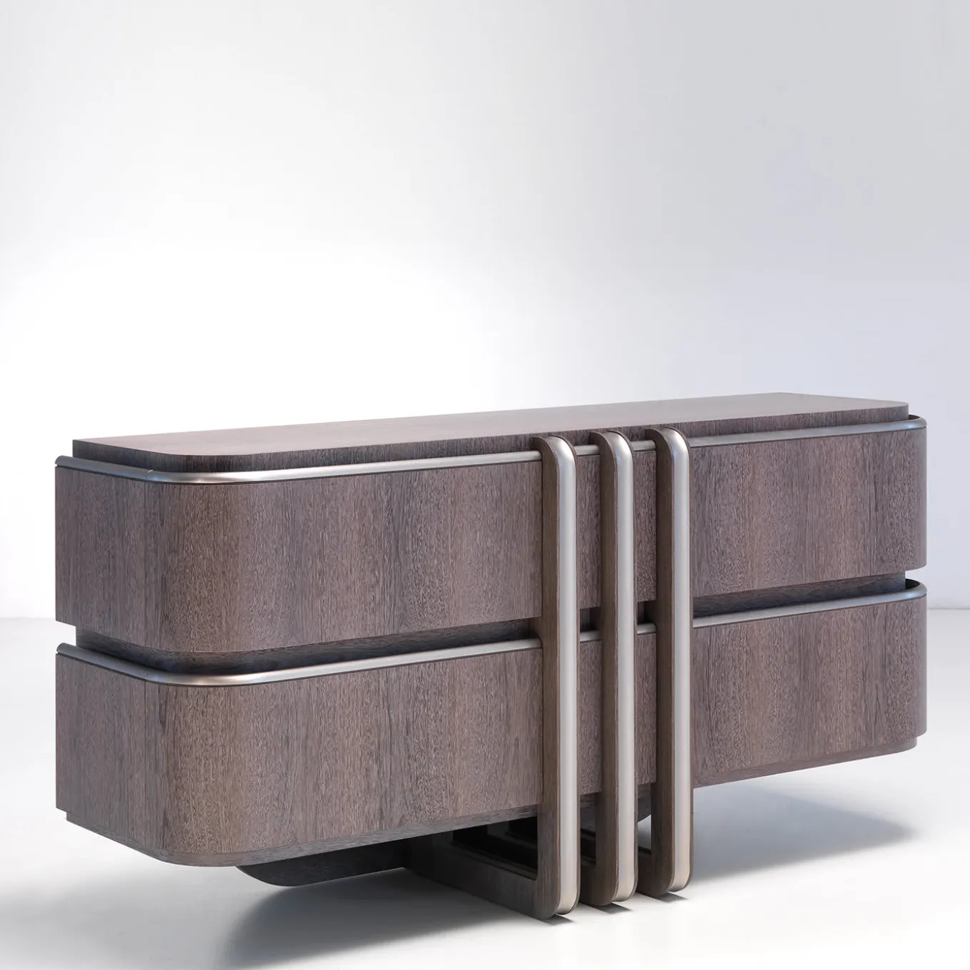 The bold yet harmonious lines characterizing this imposing nightstand exemplify the most exquisite modern taste. The structure is crafted of durmast and sucupira, precious woods turning this piece in a rare object of functional decor capable of elevating the aesthetic of any bedroom. The luminous brass inserts accenting the design’s borders and running vertically its drawers add further value to the nightstand.