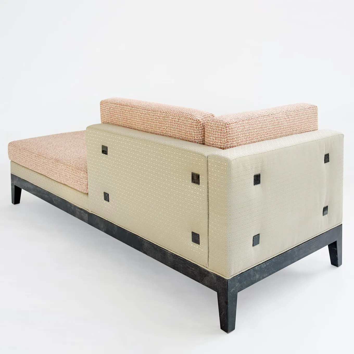 Comfortable and elegant dormeuse with wooden base finished with a charcoal grey goatskin and high gloss. Goatskin details are also present on the back cushion. Unholstered with different fabrics, combined with different patterns and textures. Please, ask the Concierge for customization options.