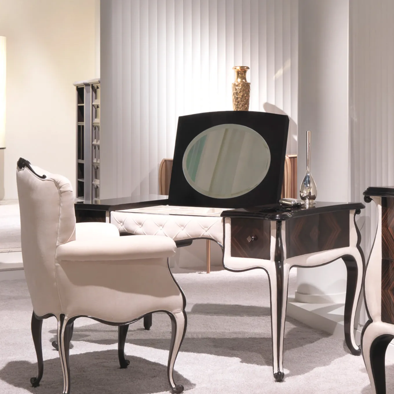 The distinctive and intense veining typical of Makassar ebony are showcased in this exquisite vanity table gracefully resting on four cabriole legs. Precious inserts of light leather extensively adorn the design, including the quilted motif in the front. Two spacious side drawers complete the vanity table. Table also available with alternative fabric details upon request, please contact the Concierge for details.