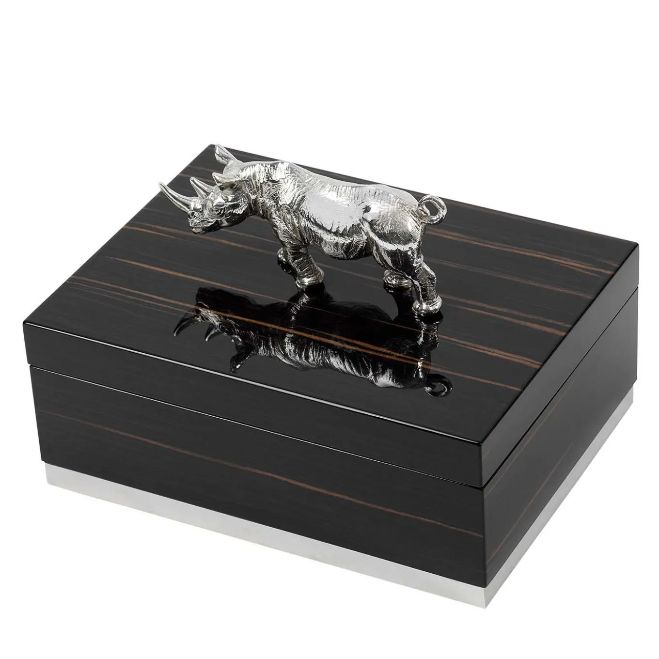 Characterized by a simple shape and prized materials, this superb box combines the rich dark Macassar ebony frame with the shimmer of the silver-plated brass Rhinoceros sculpture that adorns the lid. An elegant addition to a living room console, coffee table, or office desk, the box is lined with soft eco-leather to safely store the most precious and delicate objects. Expertly crafted by master artisans, the glossy finish of the wood further enhances the elegance of this piece of functional decor that will shine in any interior.