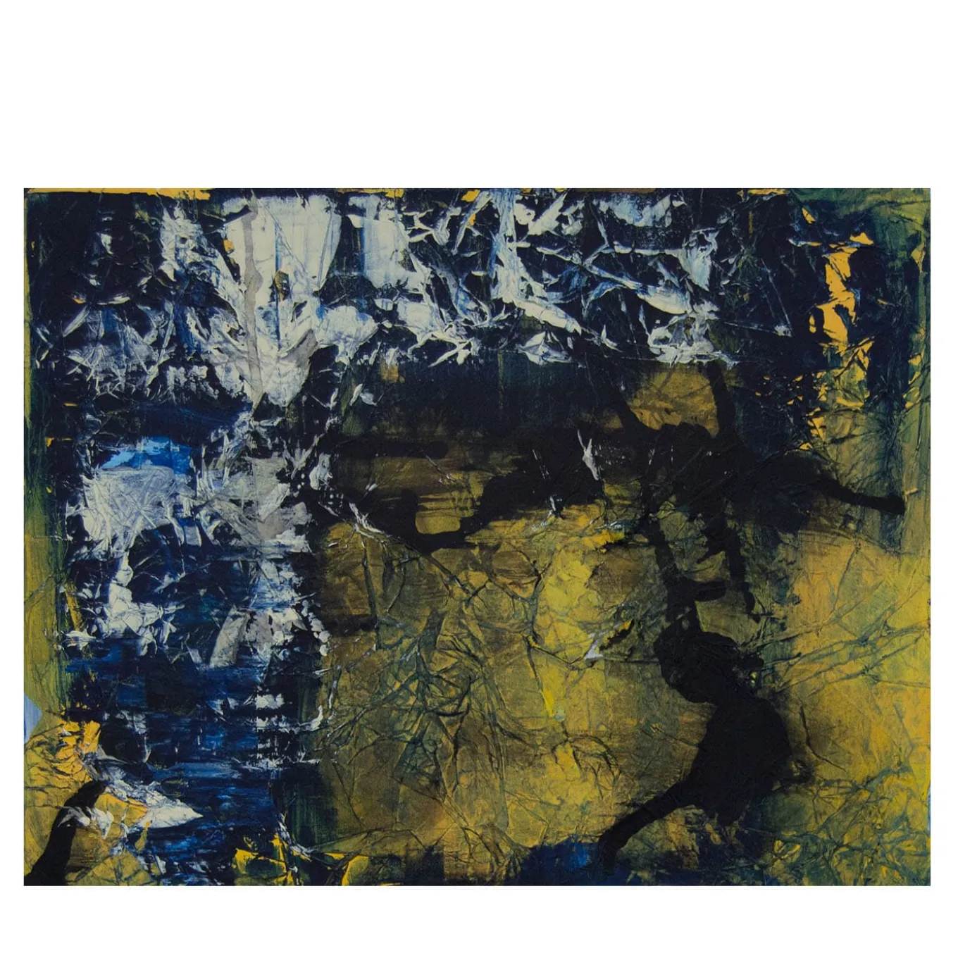Painted visualizing a golden rain falling on a fantastic glowy landscape, this painting brims with evocative charm. Strips of acrylic colors – with a prevalence of midnight blue and yellow – descend on the tridimensional surface, a special textural effect obtained by covering the canvas with multiple layers of tissue paper. Supported by a back panel and delivered unframed, the piece is supplied with its authenticity certificate.