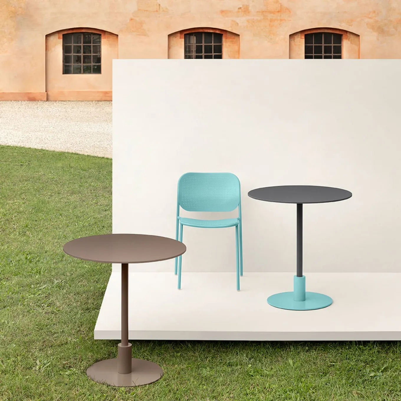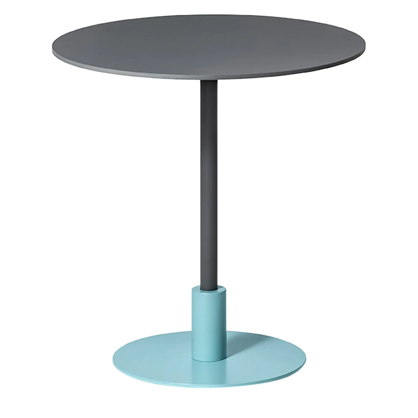 An unmistakable predilection for geometric minimalism characterizes this sleek round table by Gabbertas Studio. Stemming from cylindrical support in turn fitted to a disk-shaped base both finished in pastel turquoise (RAL 6034), the tubular leg shares with the round top the same elegant grey-green tone. The table is suitable for outdoor and indoor use. Please consult the Concierge for available shape and color variants.