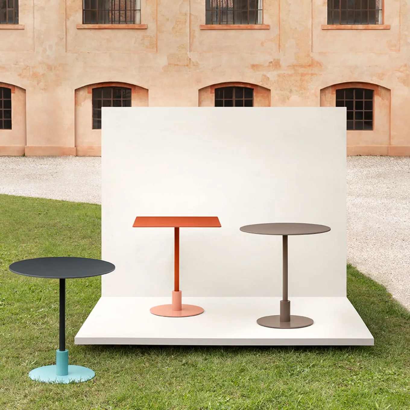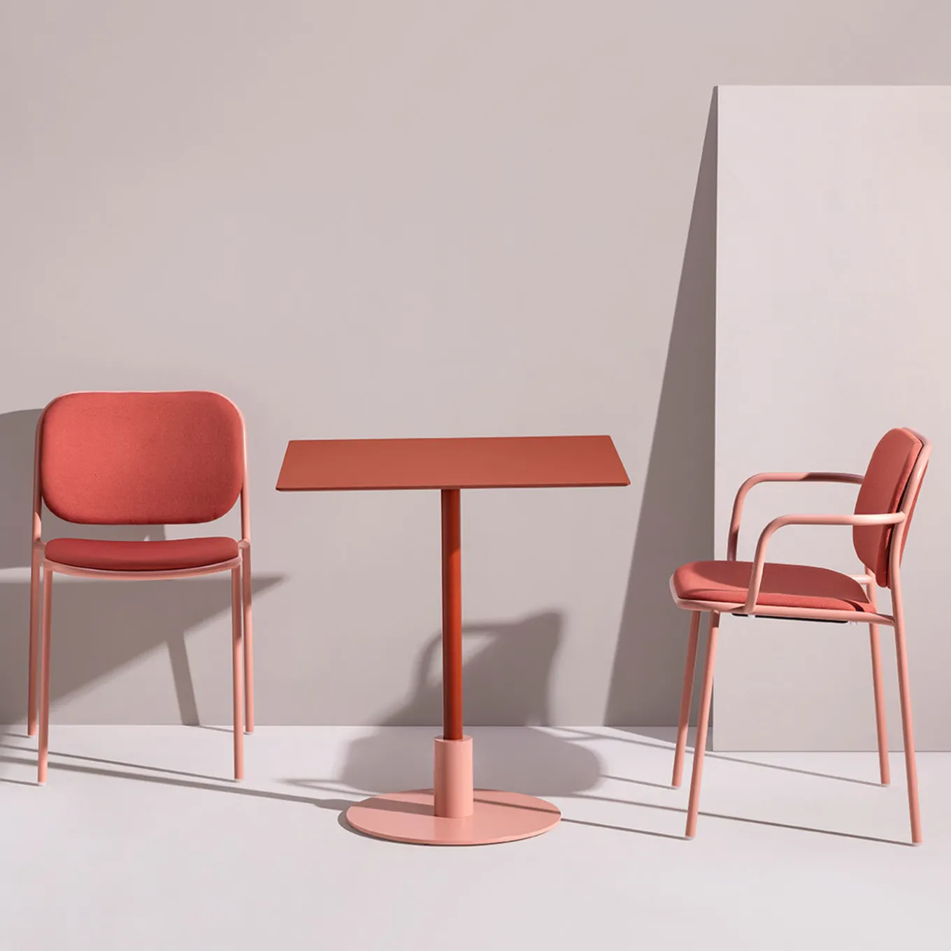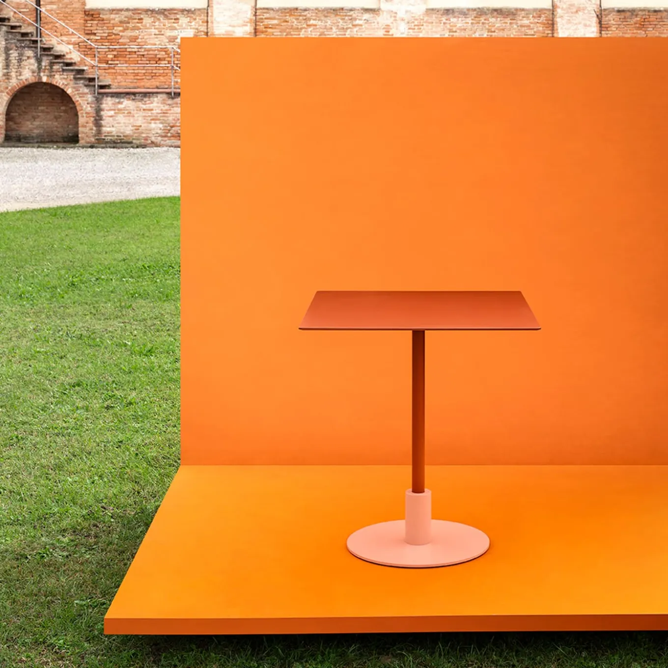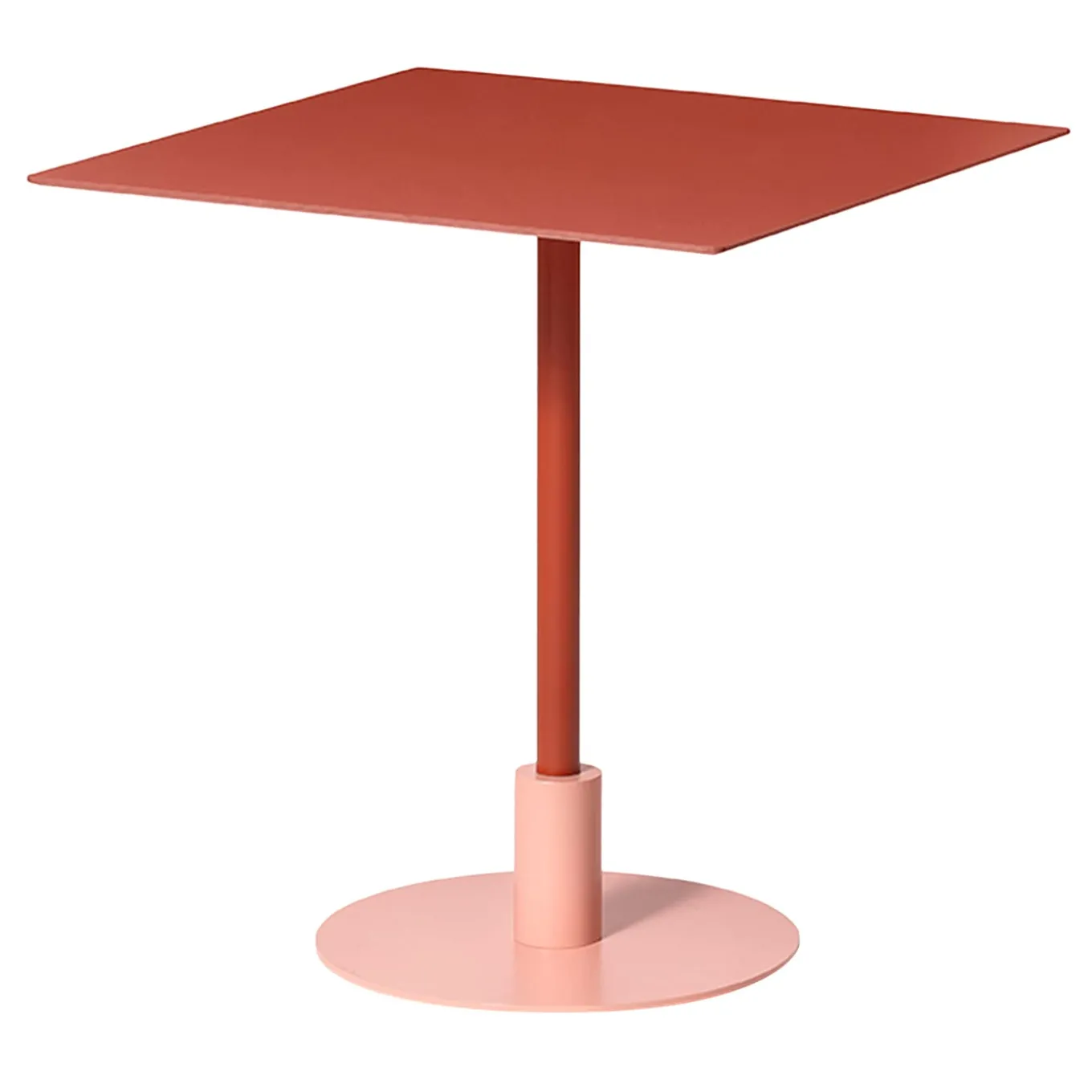 Stylish and warm in its coloring as it is rigorous in its contrasting geometric profiles, this table by Gabbertas Studio makes for a sophisticated addition to contemporary decors one wants to accent with a pop of color. Its resistant HPL (High-Pressure Laminate) structure finished in brick red consists of a square top sustained by a single tubular leg that results inserted in a cylindrical element, in turn fitted to a disk-shaped base. The table is suitable for outdoor and indoor use. A wide variety of finishing options are available, contact the Concierge for more information.