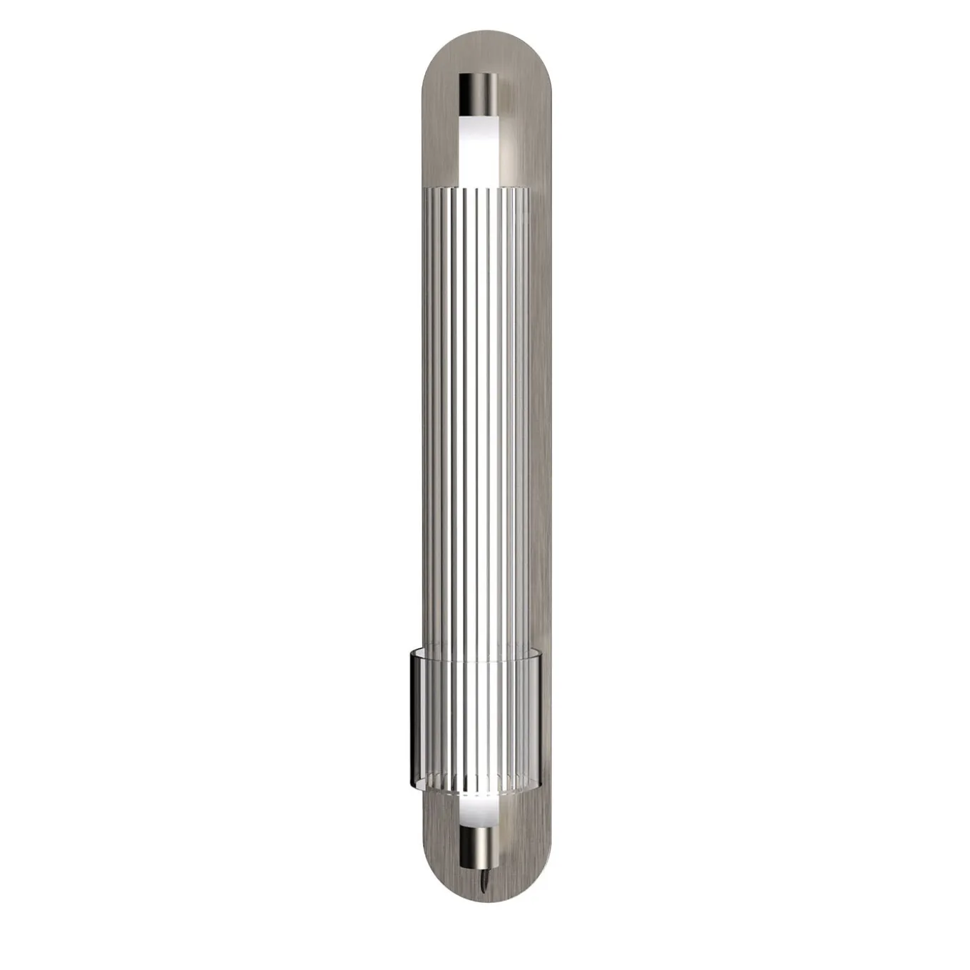 This piece features a sleek brushed steel structure supporting a frosted light tube encased by a series of glass rings. The design combines vertical textures and translucent elements to create a sophisticated wall fixture that offers diffused lighting with a contemporary aesthetic. Suitable for various interior settings, this sconce enhances ambient illumination while adding a refined architectural detail.