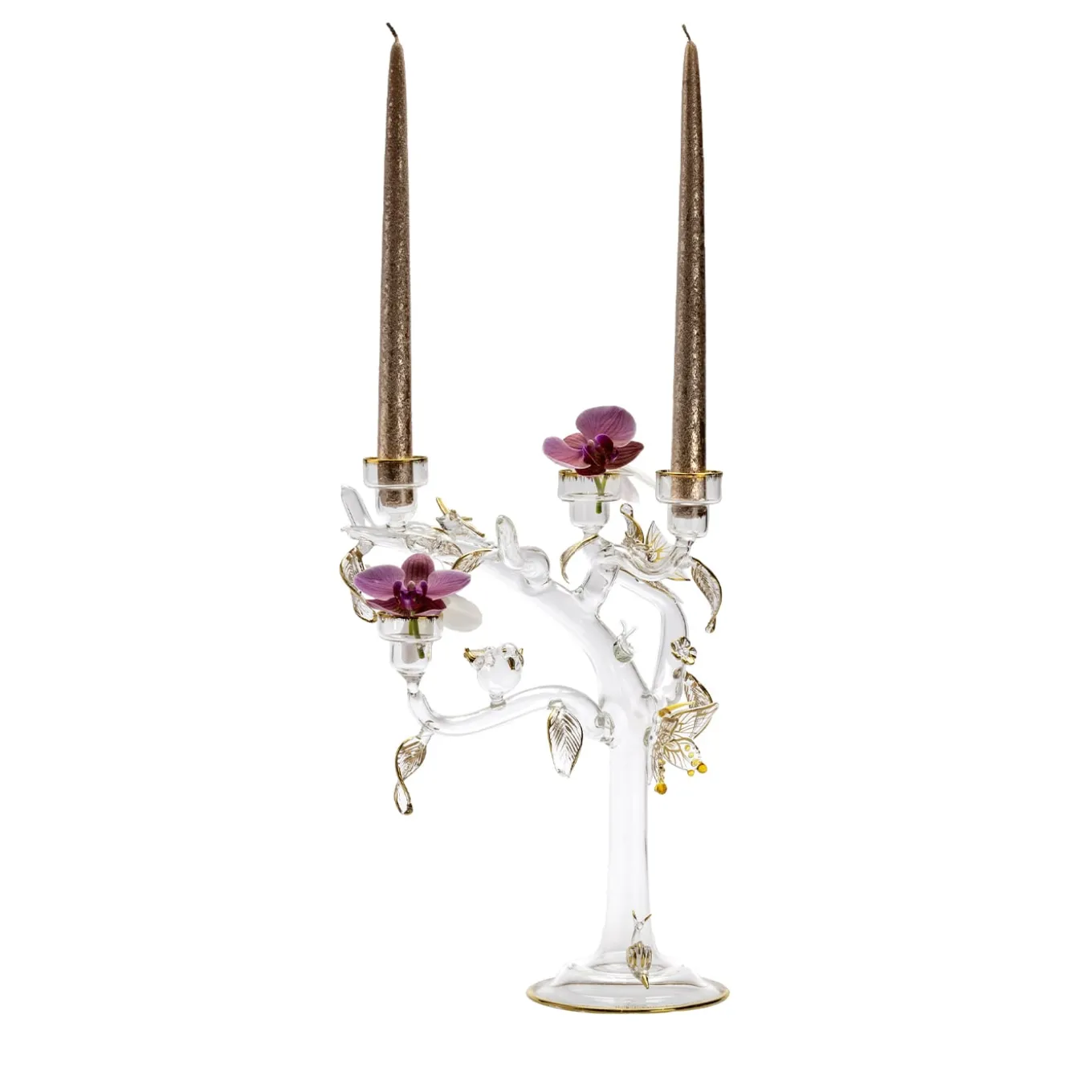 The Glass Eden Gold Candleholder, handmade in Venice, is a stunning celebration of nature’s beauty. Designed by Catherine Urban, this piece evokes the Garden of Eden, featuring delicate leaves and glass creatures that dance in candlelight. The festive edition boasts sophisticated golden accents, with each element hand-painted in 24k gold. This candleholder enhances any decor with its charm and versatile design, accommodating candles and fresh flowers. Each piece is a one-of-a-kind creation.