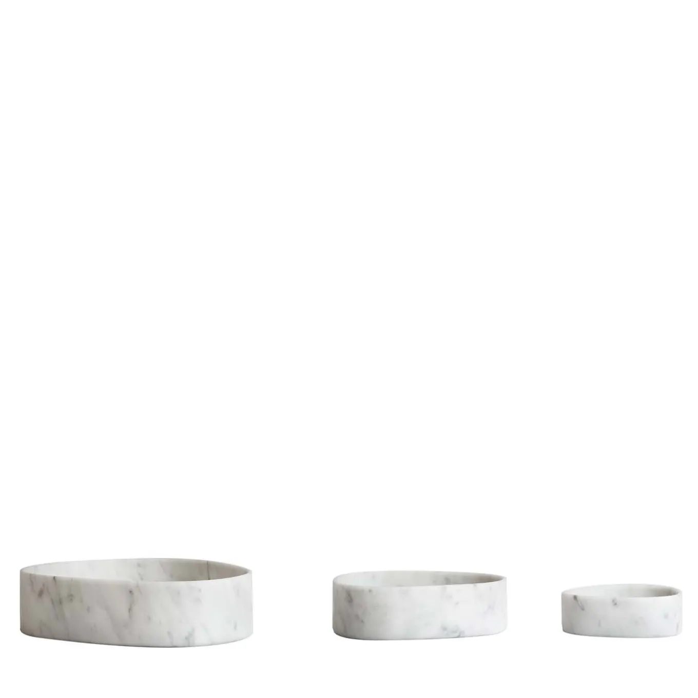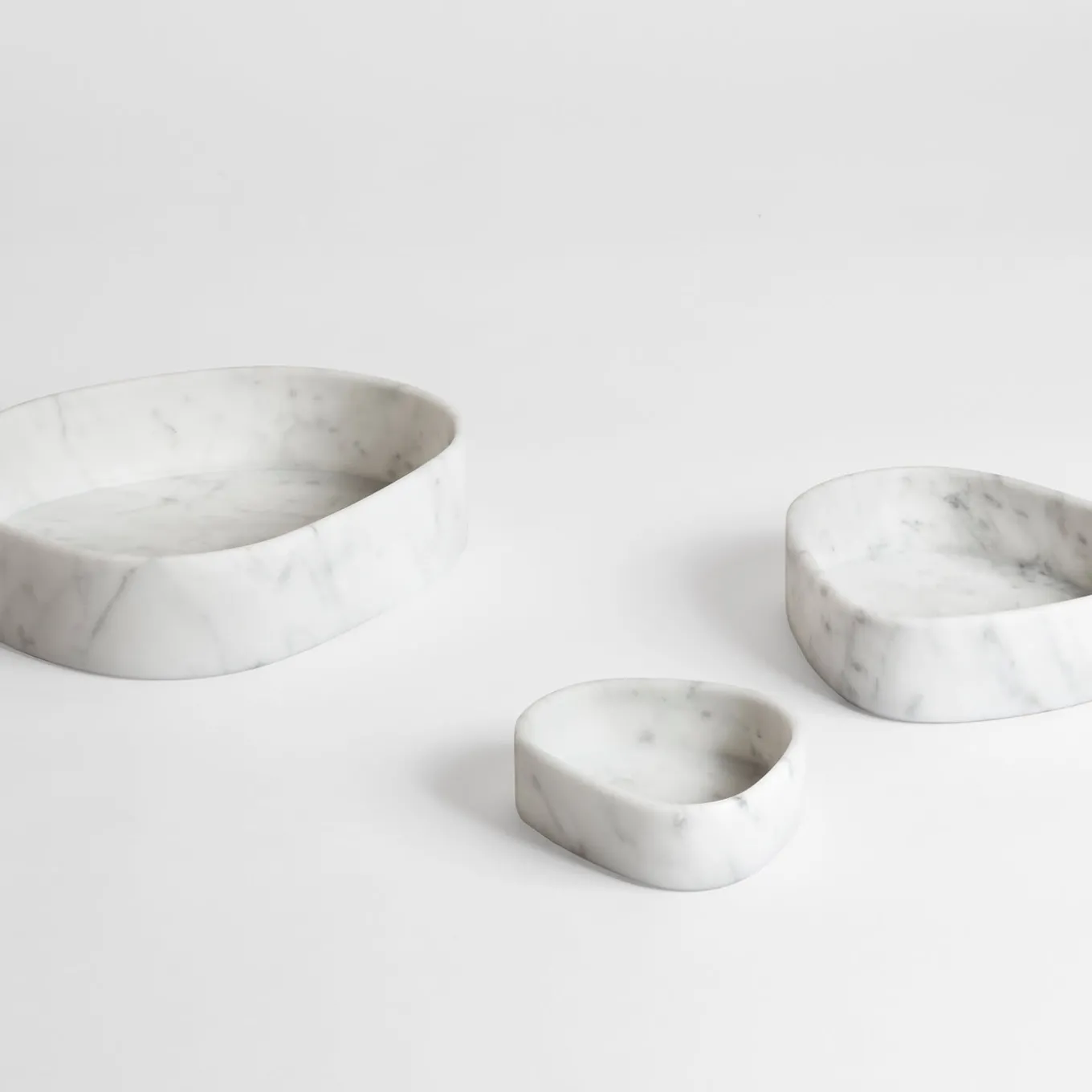 This elegant set of three irregularly-shaped, unique bowls (12 x 11 x H4 cm, 17 x 16x H5 cm, and 24 x 20 x H6 cm) is crafted of white Carrara marble to reveal high-quality everyday objects that are a pleasure to use. Also alluring if left bare, these functional and charming bowls are available in lava stone as well, please consult the Concierge for details.