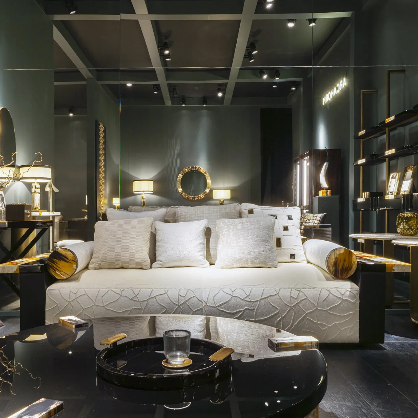 Chaise longue upholstered in a refined fabric with armrests covered in pebbled leather Aida, Onyx colour, featuring arm tables in horn and glossy lacquered wood. The base has a matte lacquered finish. It includes two decorative cushions with horn inlays and leather details with handmade stitching. Padding combines multi-density polyurethane foam, goose down, and memory foam for enhanced comfort.
