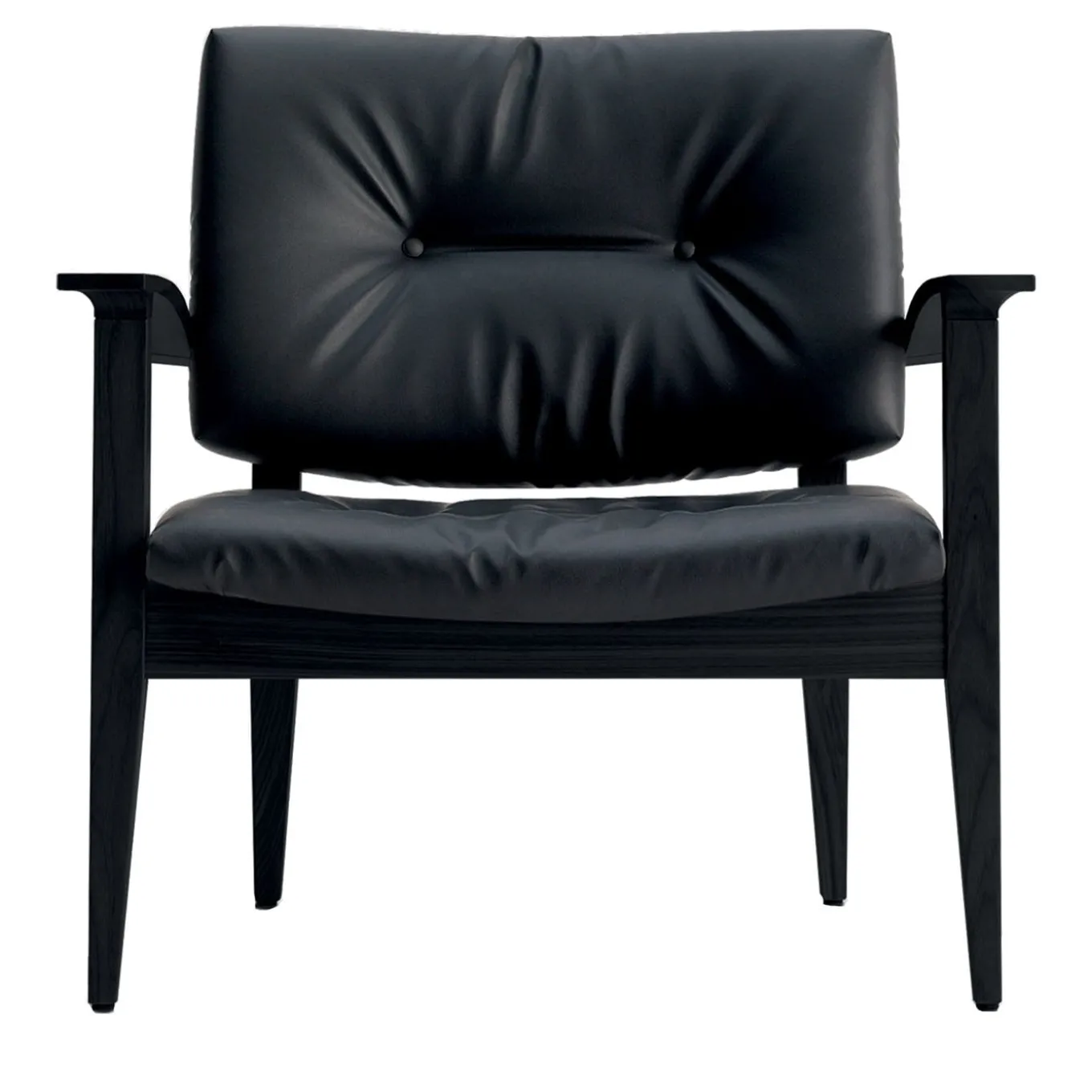 Timeless class defines this clean-lined armchair by Werther Toffoloni. Rich in structural details that draw attention towards the grain of its solid black-stained beech frame, its plush allure is stated by the fine black leather covering both the seat and backrest, the latter subtly decorated with a couple of buttons. Stool and chair counterparts are available in the Artemest catalog.
