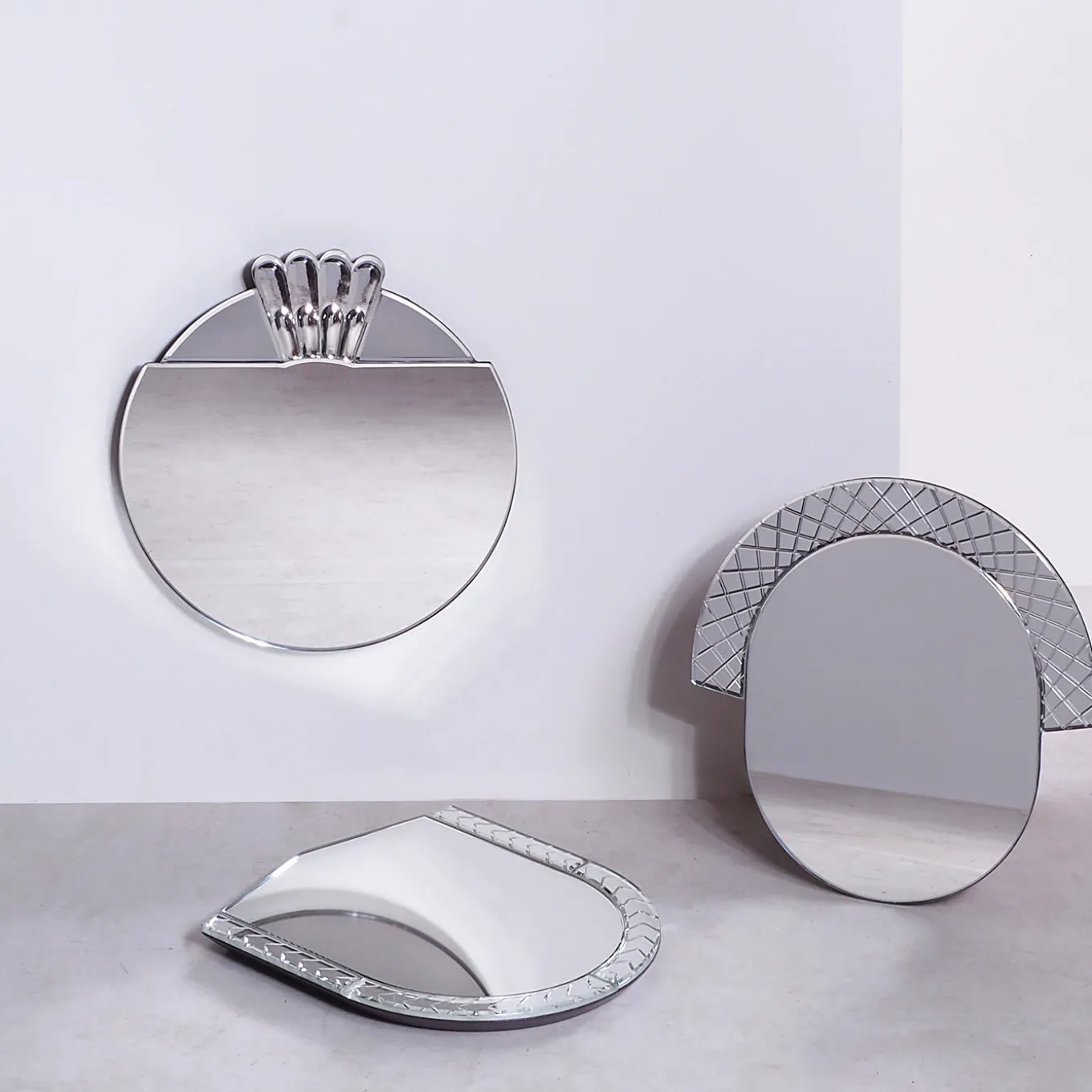Elemento is a series of solid glass mirrors full of depth and bold graphic lines, expertly crafted by hand in Murano. This collection is the extention of the Scena collection, they take little details from that, always creating charm. Working with the skilled glass artists of Murano, a subtle use of perspective and depth was created by the intricate carving and grinding of the mirrored glass surfaces, then silvered to give depth to the details.