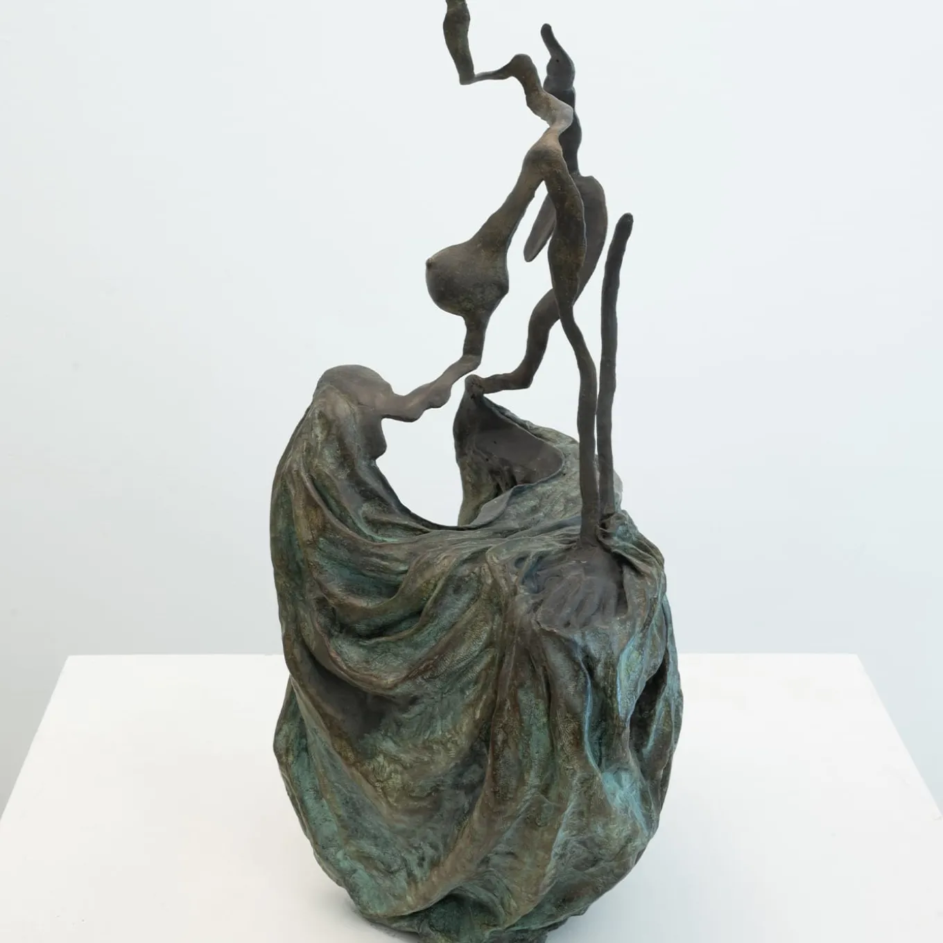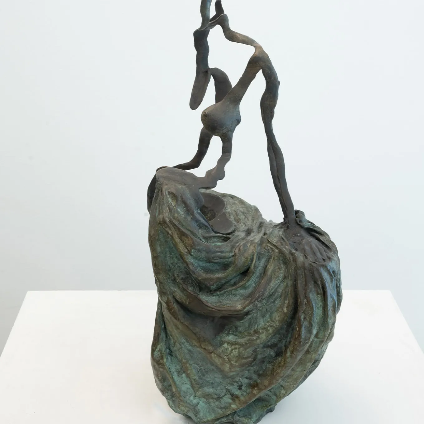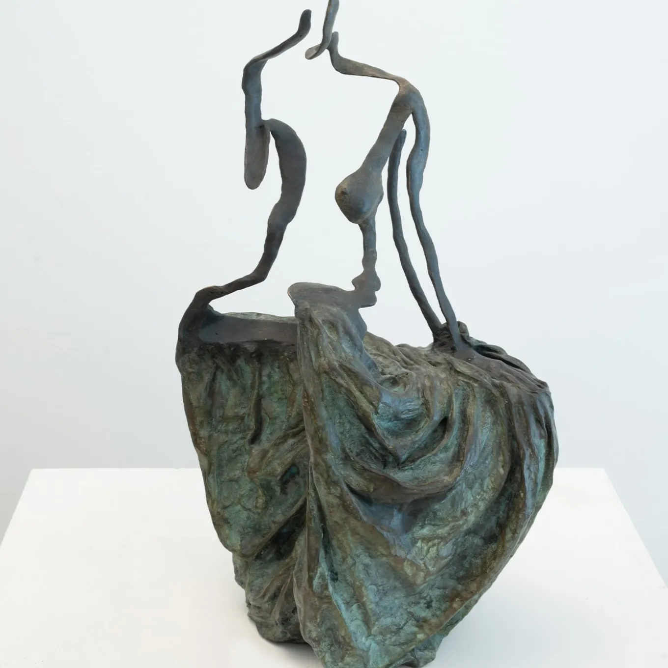 As in a drawing, the bronze line traces the profile of the female figure sat from behind. The harmonious composure of the classical figure dialogues with more dramatic moments, between the volume of the absent body of the woman and her image.