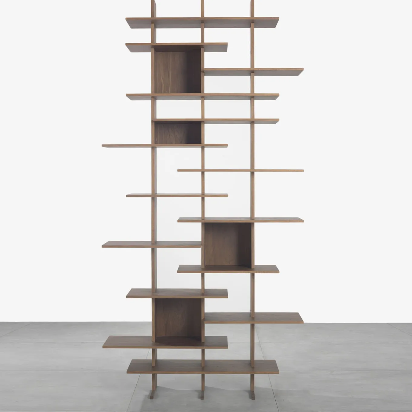 This modular, double-sided bookcase has a clean, yet sculptural, contemporary design. It features an intriguing structure handcrafted of Canaletto walnut or wood fiber, made up of shelves, dividers, and load-bearing back panels. Designed by Cesare Arosio and Beatrice Fanchini, it is available in a wall version as well as a partition unit with corner and/or ceiling fixing options. Other modules are available in the Artemest catalog. For more information, please contact the Concierge.