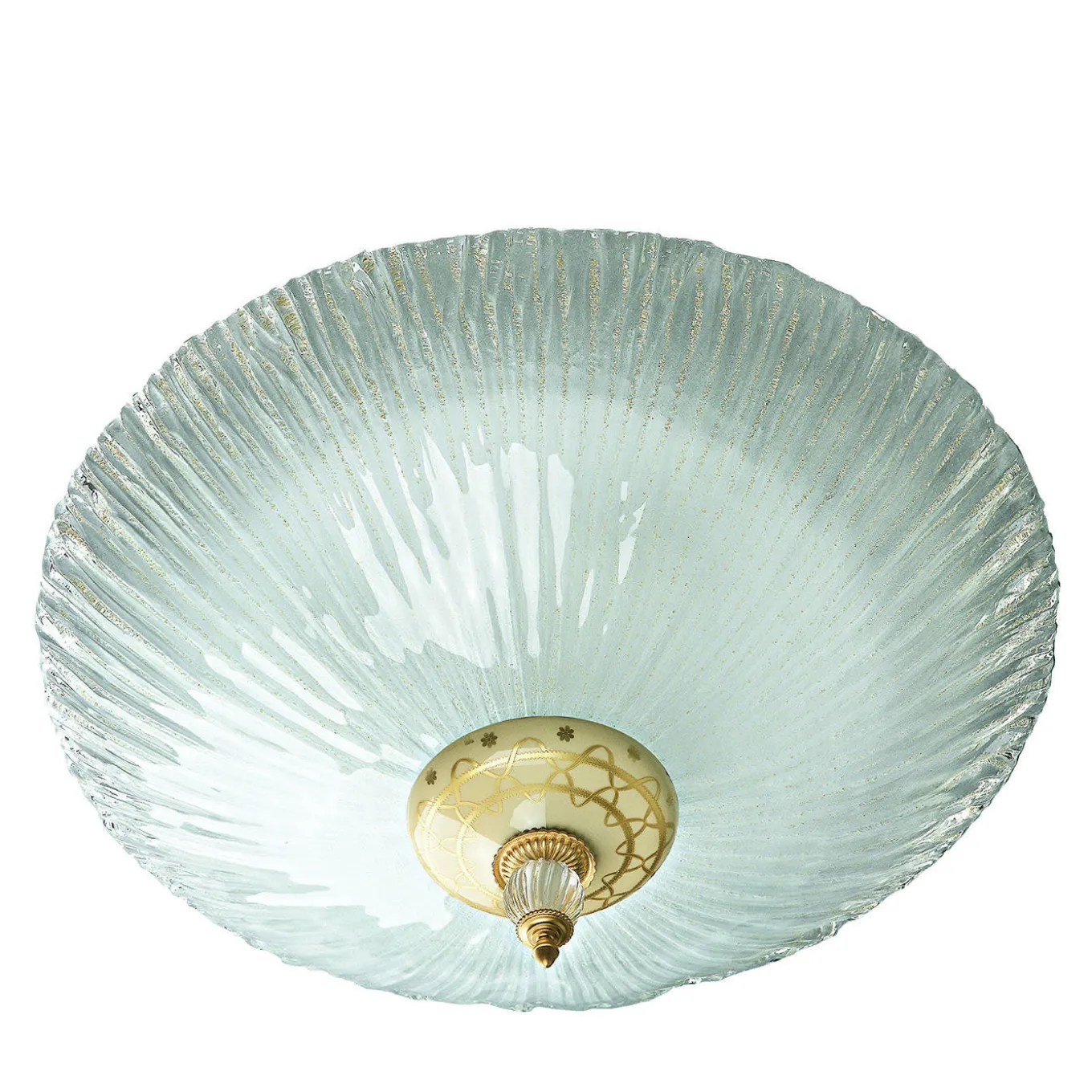 This classy ceiling lamp from the Elite Collection will discreetly enhance any classic decor with its luxe and evocative look. The light emitted from the three E27 bulbs (max. 60W) gets filtered through the glass diffuser, whose texture evokes seashells. Dainty components in metal and accented in gold flank a small glass sphere, further decorative element paired to a domed piece in ivory porcelain decorated with gold details.