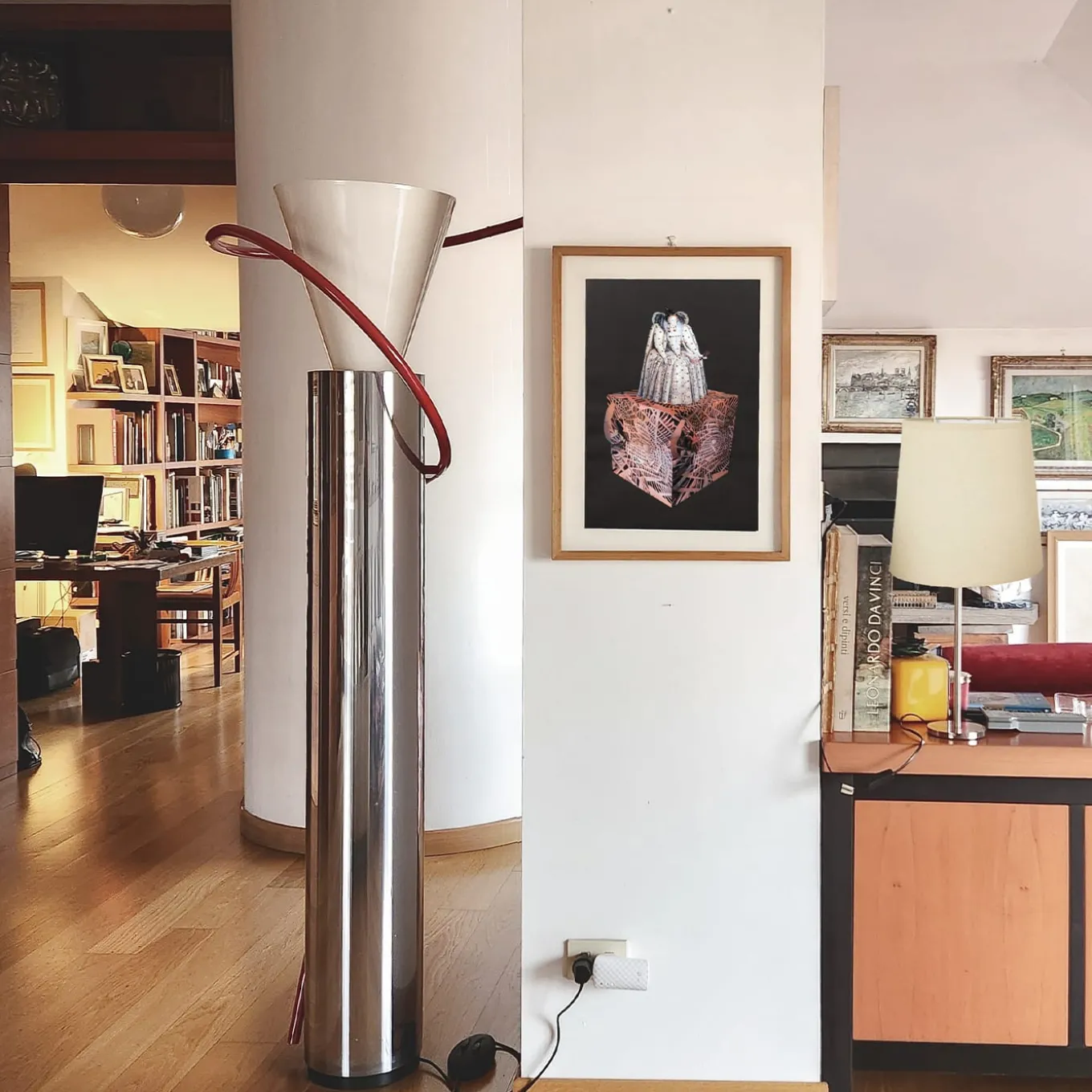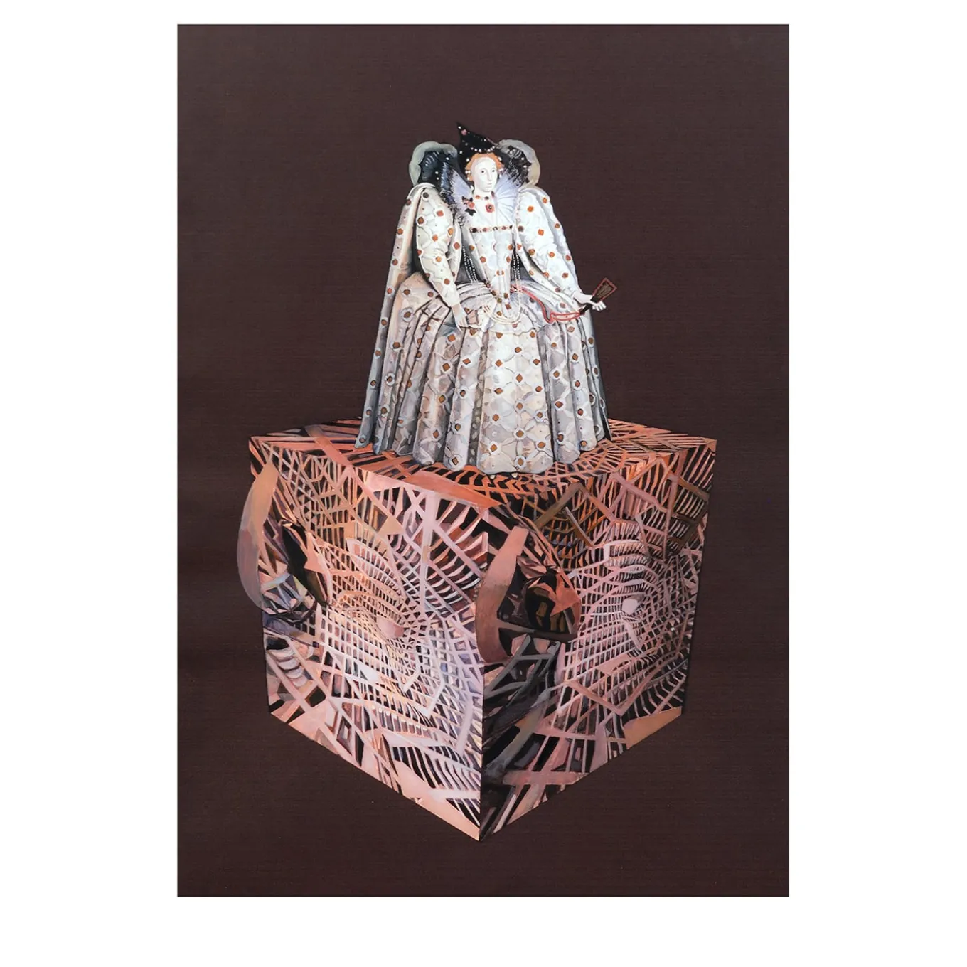Classic and modern artistic influences get artfully coupled in this exquisite eclectic painting dedicated to queen Elizabeth I. Depicted wearing an ornate dress, she stands on a cube marked by an intricate geometric pattern reminiscent of Avantgarde traits. A deep-brown backdrop perfectly harmonizes with the palette of copper and beige tones. Frame not included.