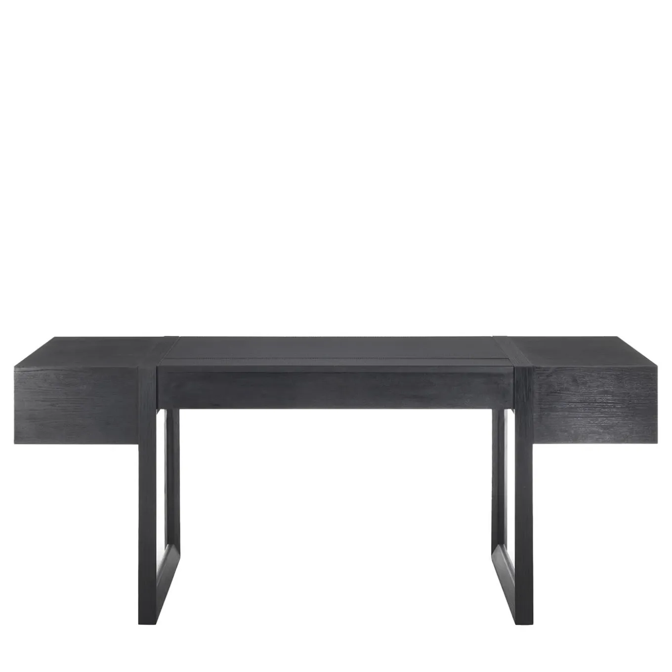 Straight lines defining bold volumes define the rigorous elegance of this writing desk, fashioned of durmast and stained in black on the outside for an effect of intense chromatic depth. Sleigh legs sustain the frame, which is equipped with a couple of drawers on both sides and a central one right beneath the top. Fine black Olimpia leather covers the central top.