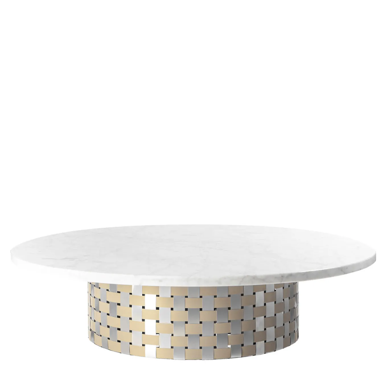 A bold and stately piece of functional decor, this coffee table will make a refined addition in any modern or contemporary living room or contract area. Inspired by the motifs of the 1960s Optical Art movement, it rests on a large round base made of a striking interwoven array of natural and gold-finished aluminum slats, known as Splot. Hidden wheels allow to easily move the coffee table. Named after Hemera, the Greek goddess of daylight, it is completed by a stunning round top in white Carrara marble.