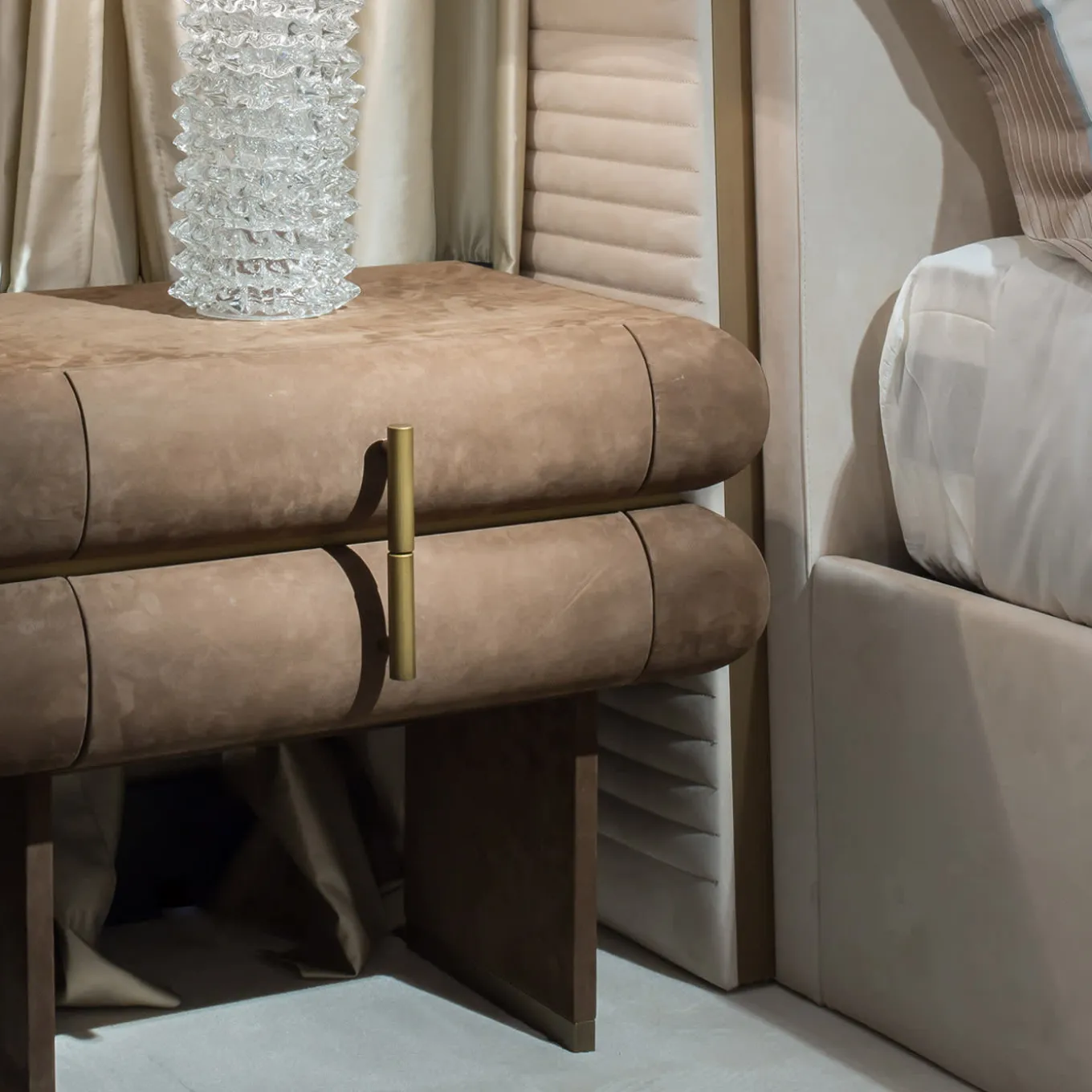 Exquisitely combining essential lines and luxe details, this elegant nightstand is an outstanding piece, widely customizable in both finishes, upholsteries, and colors. Lacquered in a deep gray hue for an extremely refined result, the whole structure stands on two thin wooden panels enriched by a brass-finished edge and comprises two drawers, with vertical dainty handles in the same finish. A further brass detail marks the connection point between the two pillow-shaped drawers’ shells. Please ask the Concierge for details on other finishes and paint colors.