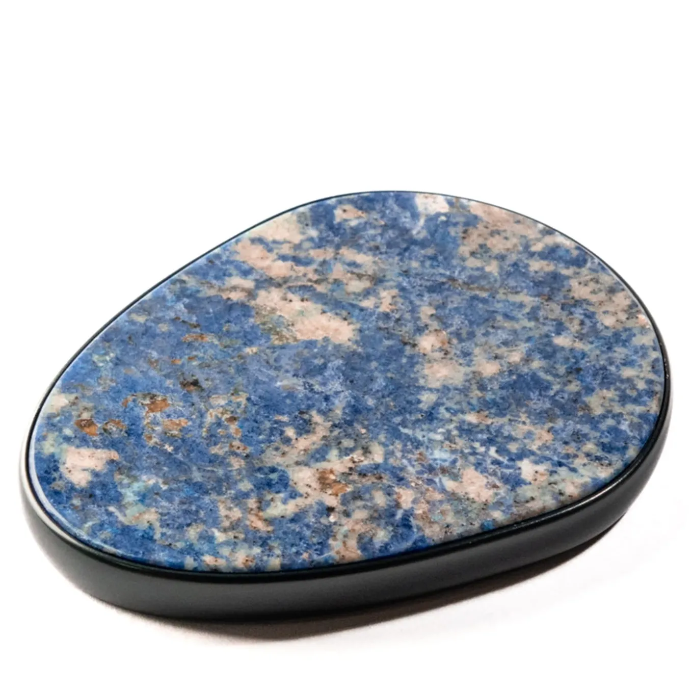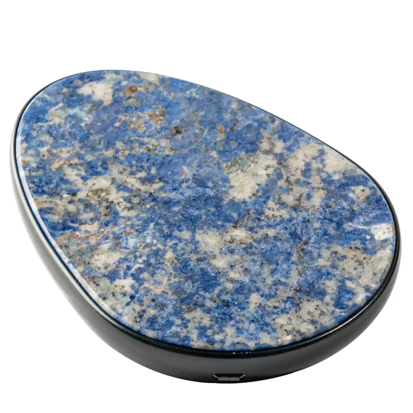 Cutting-edge technology combine with fine jewelry methods to reveal this one-off wireless desktop charger. Owing its harmonious shape to a fluid-lined anodized aluminum shell, it incorporates a stunning Sodalite insert—a volcano-origin stone obtained from magma’s solidification—whose blue-gray coloring veiled by white feldspar striping evokes ever-changing underwater glimpses. Please contact the Concierge for finishing variants. It does not fit the iPhone 14 and 15 Pro.