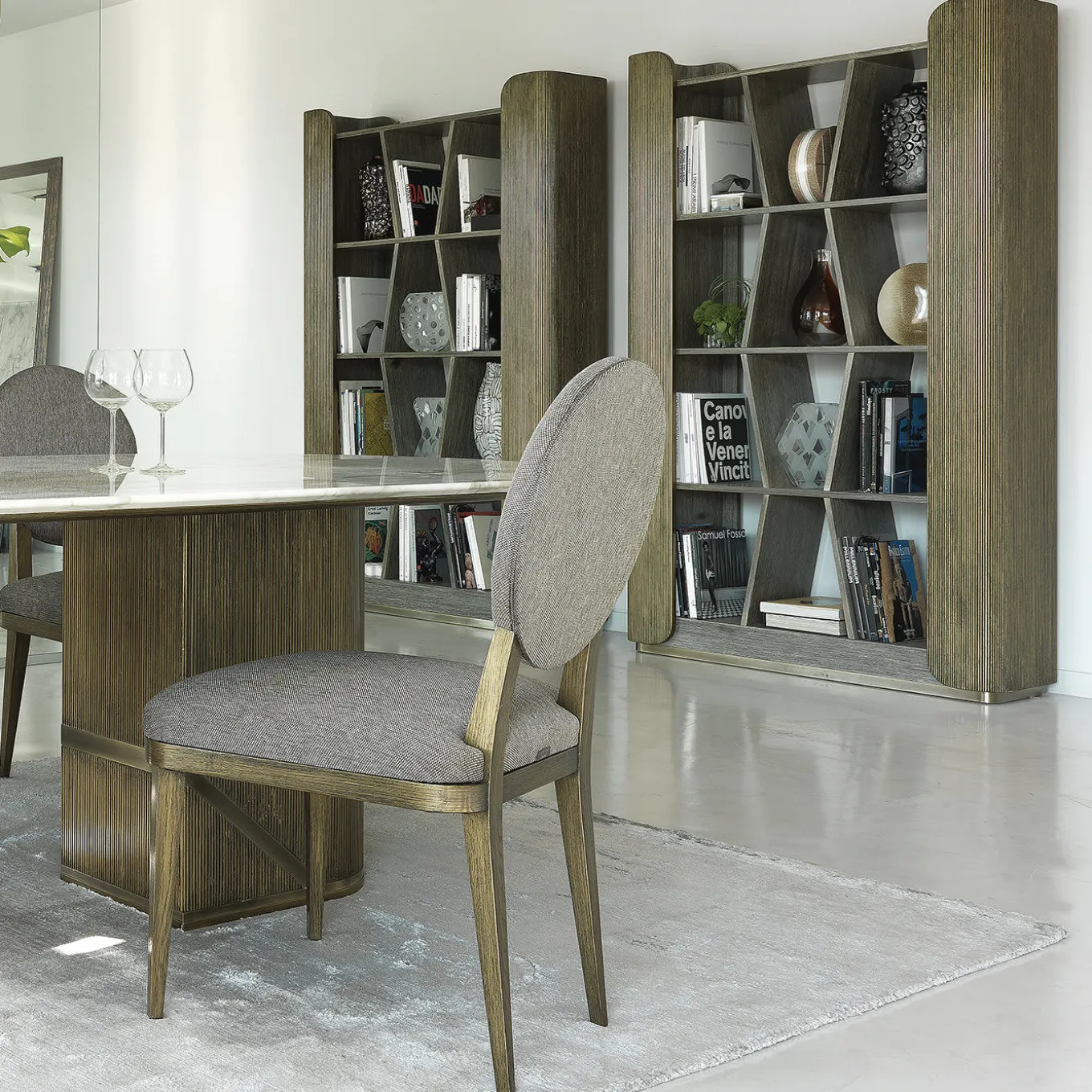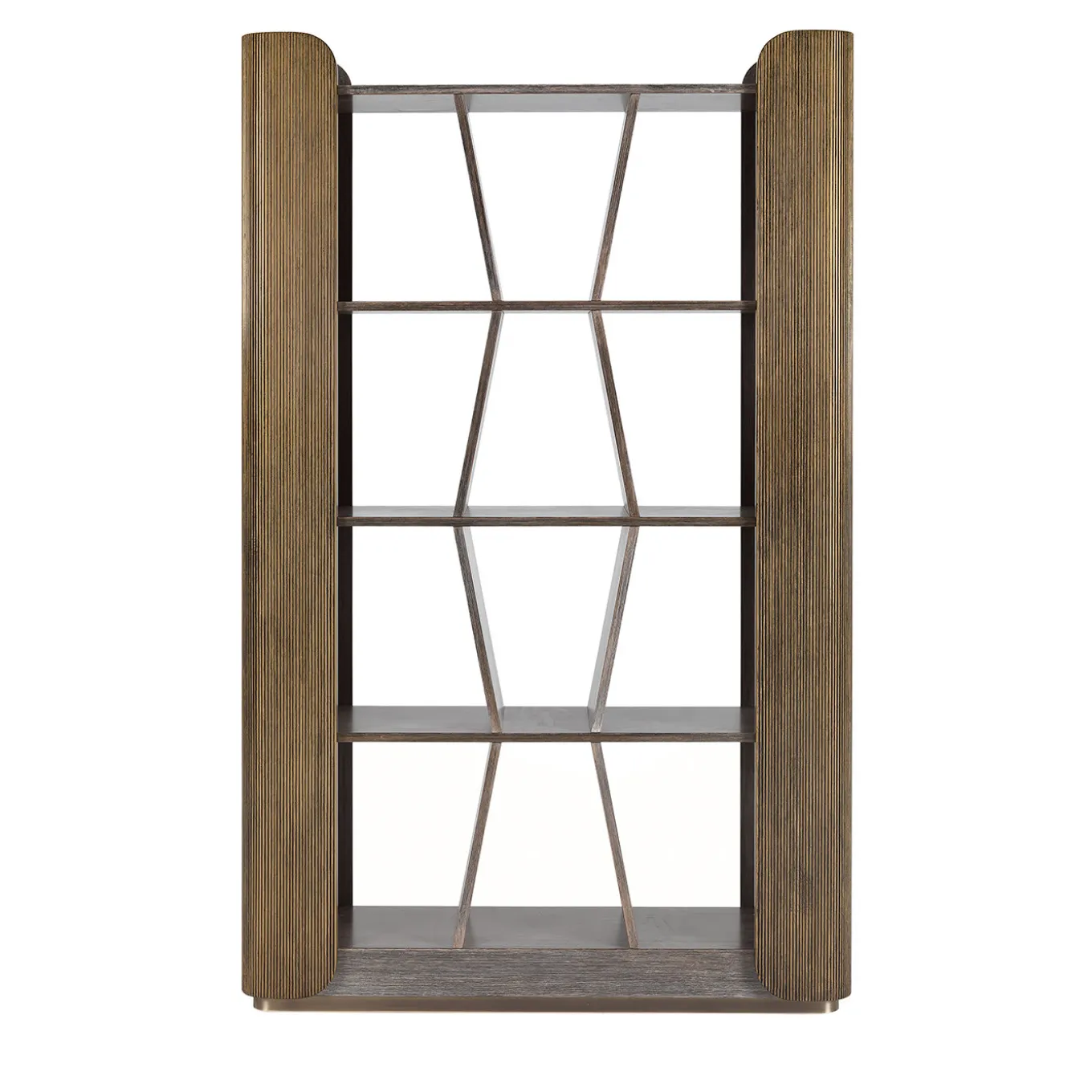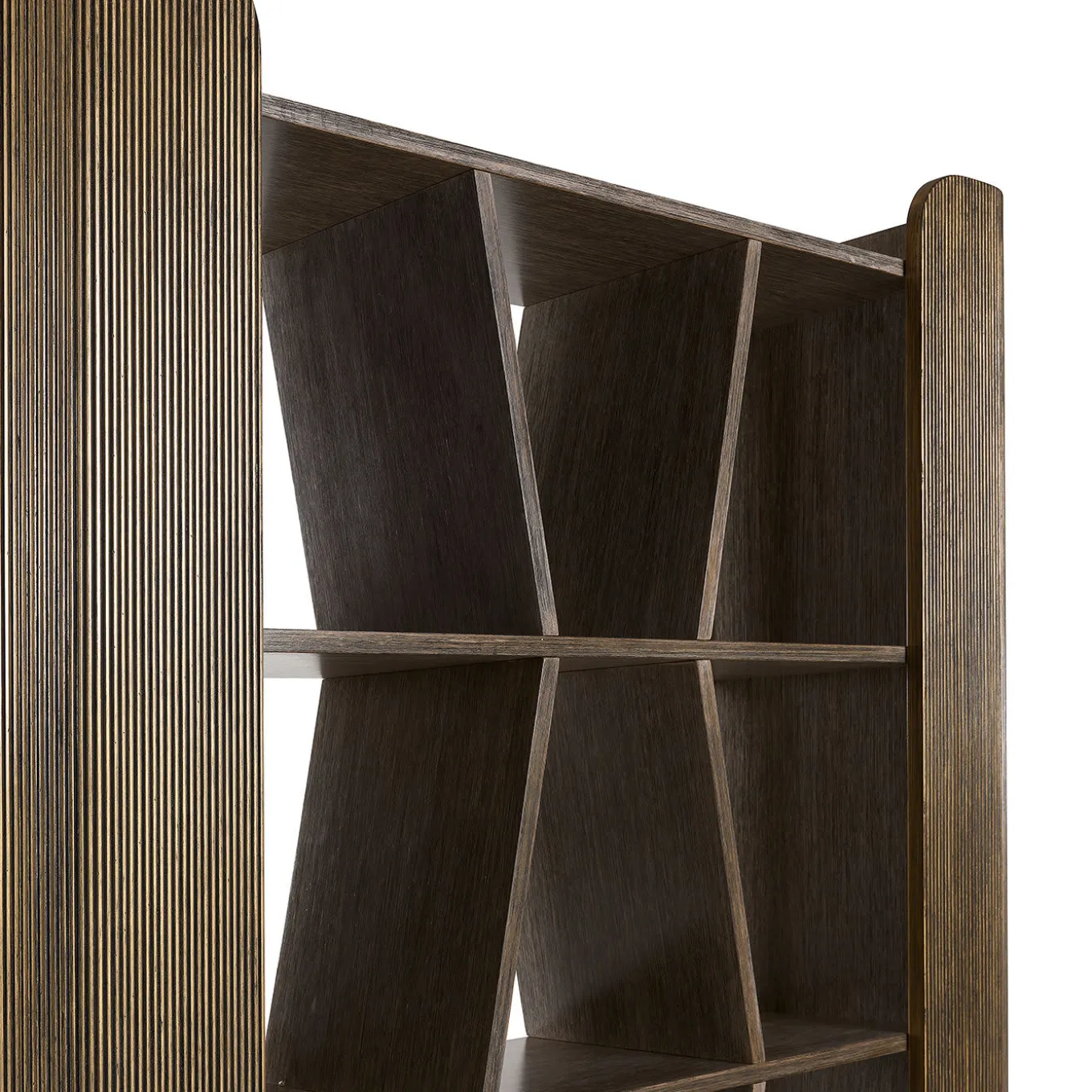 Bold and sophisticated this bookcase will be a striking addition to a contemporary home. Either against a wall, or used as superb room divider, this piece of functional decor will make a statement, thanks to its noble materials, unique designer, and impeccable craftsmanship. The plinth base in bronzed brass supports a thick bottom and sides in wood with vertical ridges that give the piece a bold character. The horizontal wooden shelves are connected with slightly diagonal elements that give the piece dynamic tension.