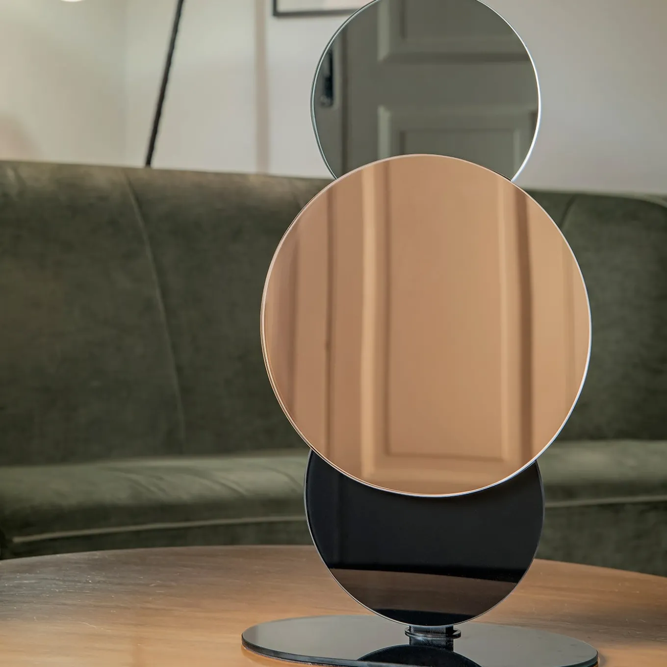 Inspired by the concept of equilibrium in more than one way: the balance of the volume and symmetry, where the constructive meets the graphic; the allusion to the anthropological dimension, where the sense of harmony, order, and fulfillment comes from the perfect formal and existential balance. The weightless lightness and two-dimensional form are enhanced by the muted colors, in a perfect playful mix of mirrors and colored glass.