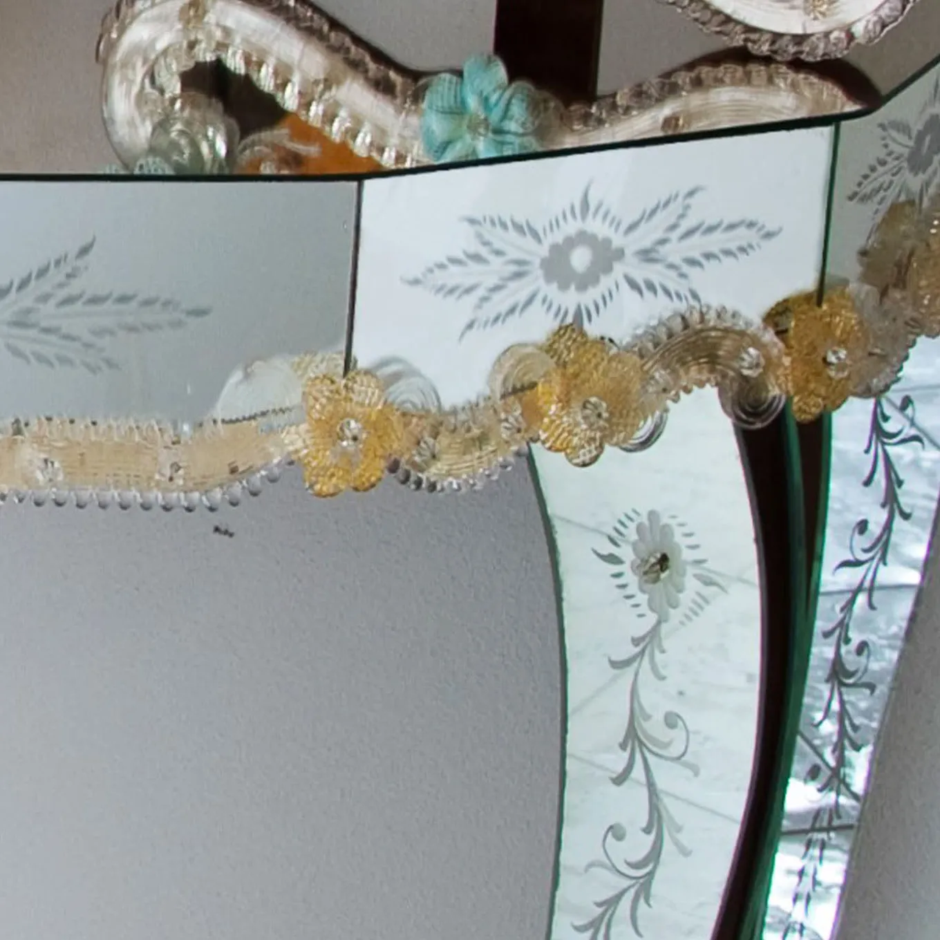 The Era Console embodies a stunning design that features a sophisticated top composed of seven angular, etched mirror surfaces, offering a captivating interplay of light and reflections. The console is supported by four elegantly shaped legs, intricately engraved and finished in a mirrored style that enhances the overall aesthetic. This remarkable piece is further embellished with a delicate golden glass frame, meticulously crafted and detailed. This piece is available for customization in size and color to suit individual tastes and interior designs. Please contact the Concierge for additional information.