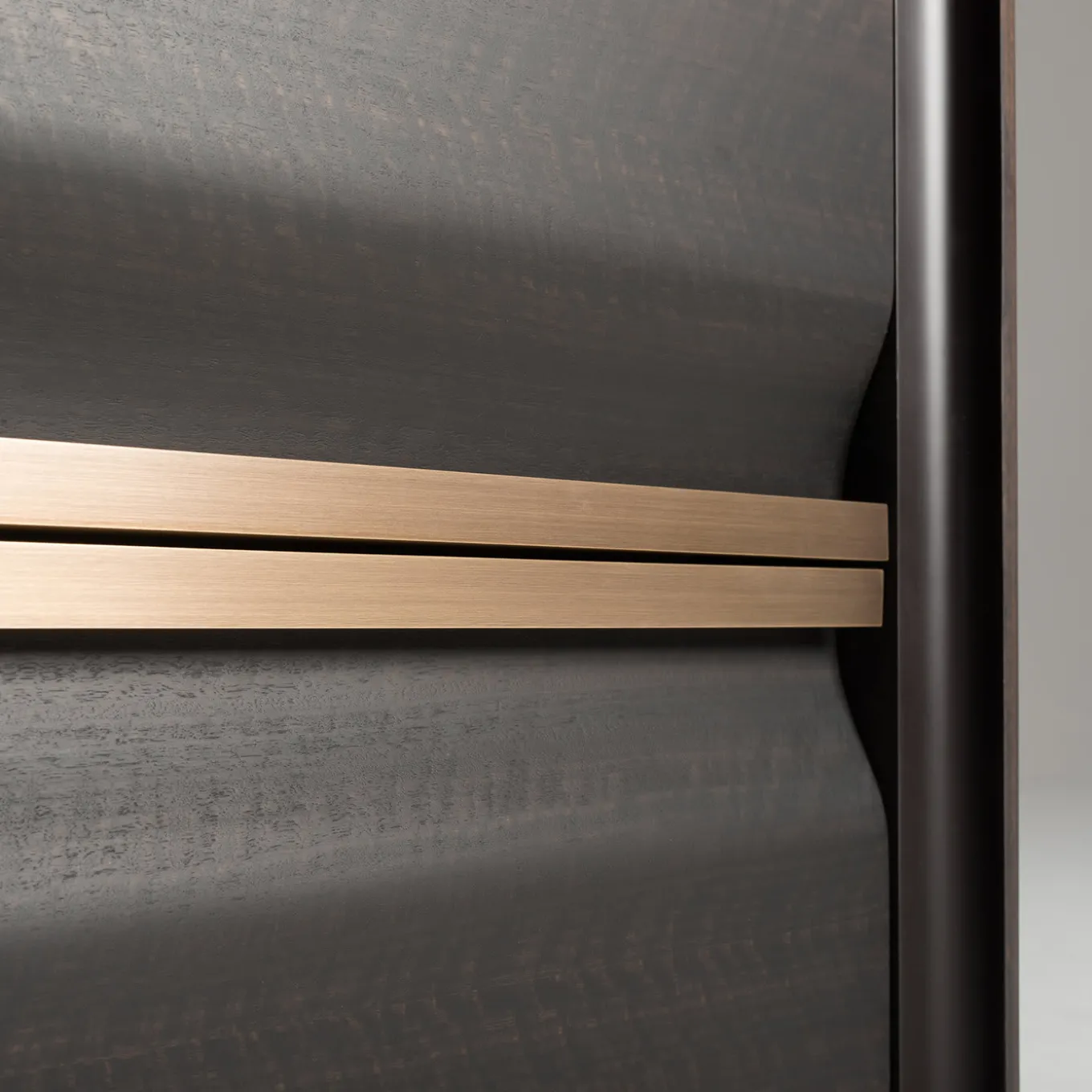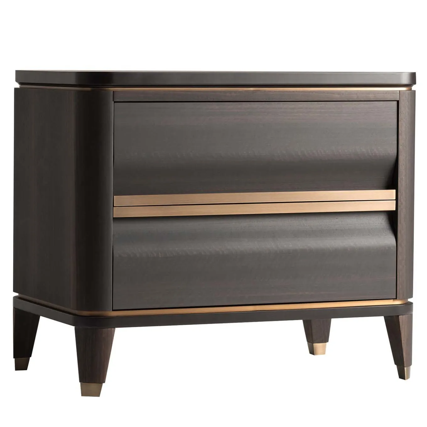 Nightstand table with a compact and essential line, made precious by the heat-treated frisee eucalyptus leaf, expertly assembled and treated to enhance the three-dimensionality of the grain. The rigorous line is emphasized by the handles and feet in burnished brass. The inside of each drawer is covered in real leather to keep objects carefully.