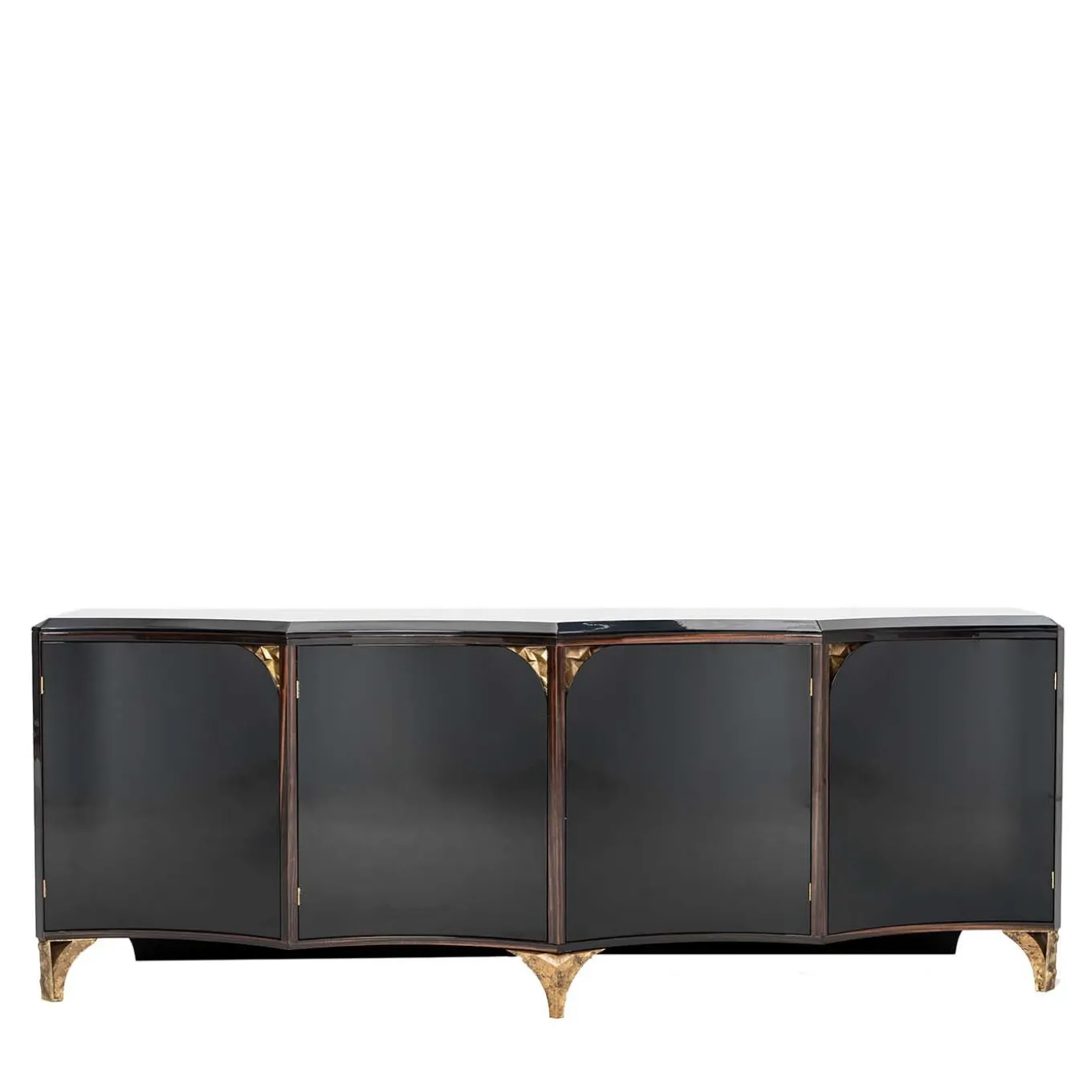 Featuring the top, side panels and inner panels in ebony veneer, the captivating Ermes Buffet of the Cosmopolitan Collection makes a grand statement in any traditional or modern dining or lounge setting. The doors and edges are lacquered in gloss black while the feet and details on the front are finished in gold leaf. Inner shelves are in extra clear crystal.