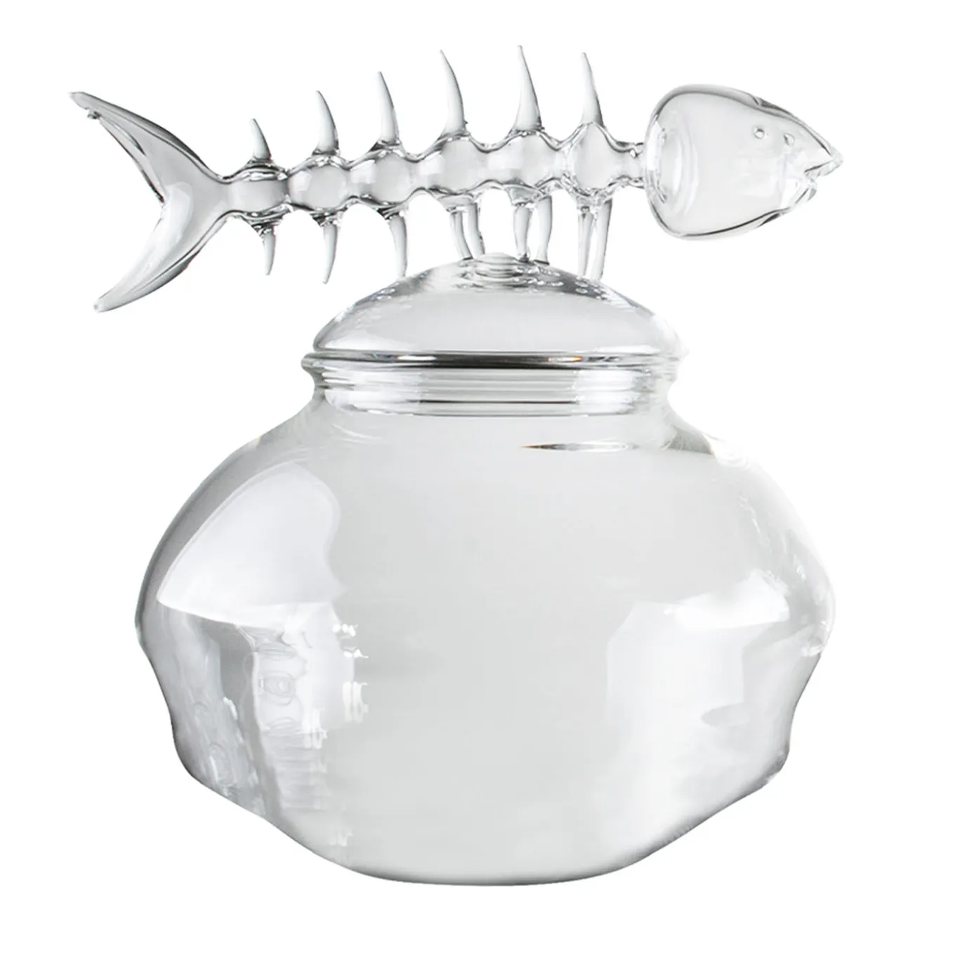 Impeccable lamp-blown borosilicate glass gives this ornamental jar with a fishbone handle a crisp transparency. An eccentric design that exemplifies the innovative ideas of glass artist Simone Crestani while remaining based on traditional glass blowing techniques.