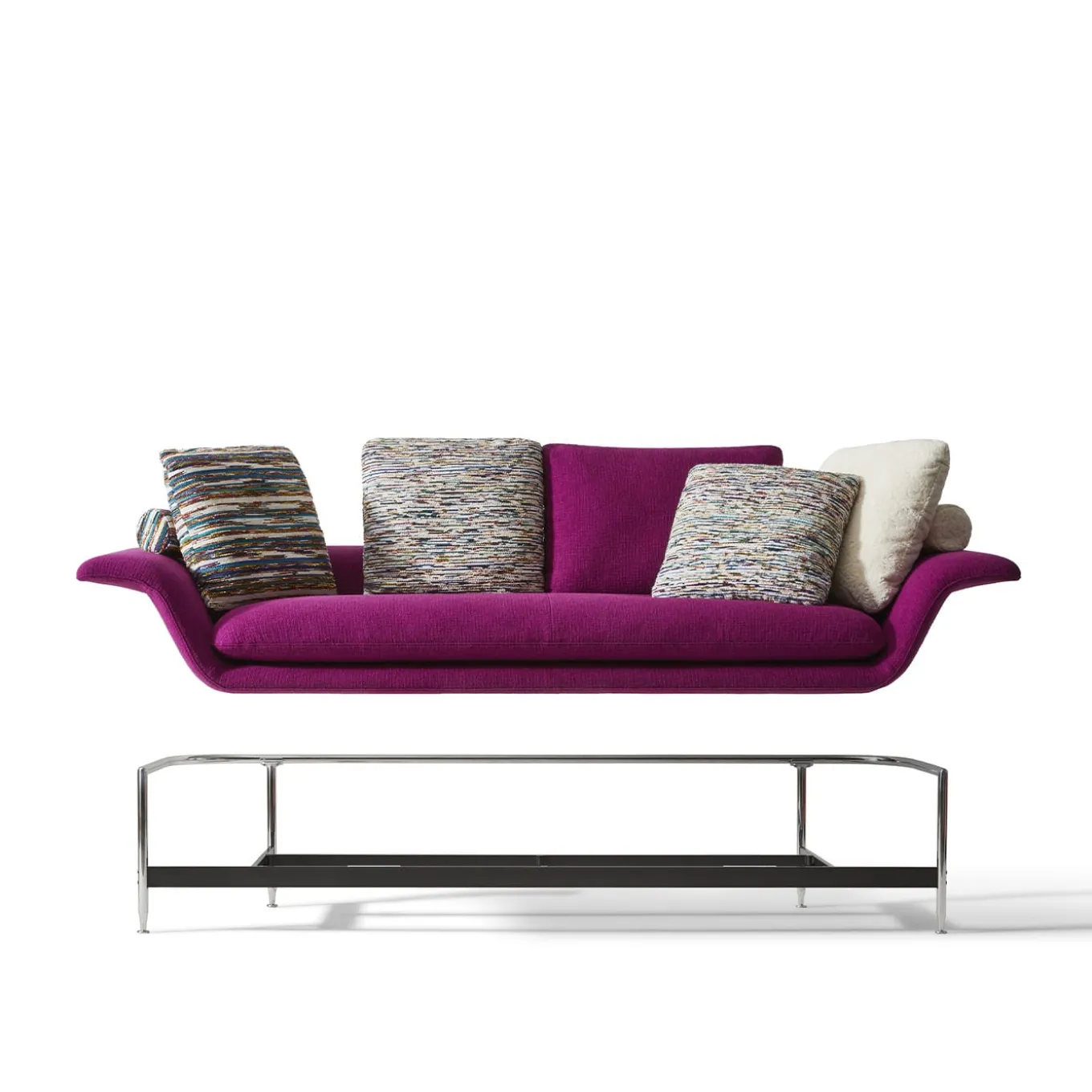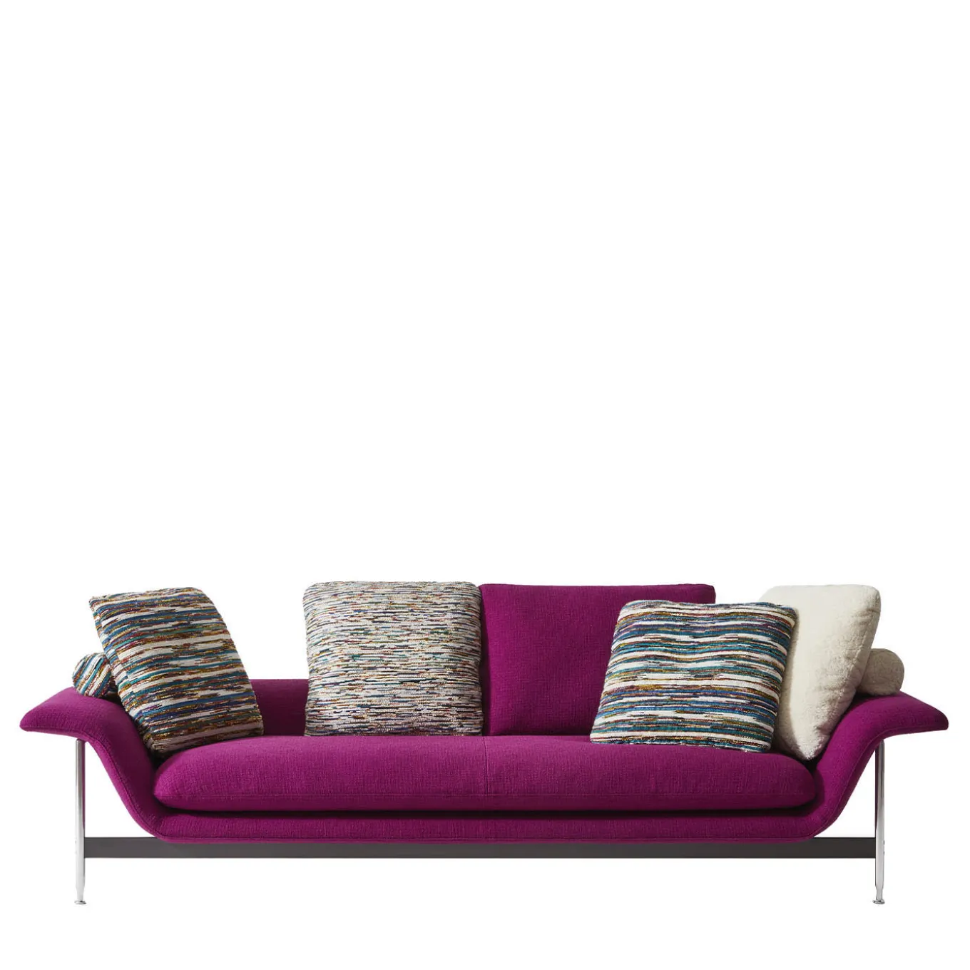 Echoing that sense of informal comfort popular in the ’60s, this exclusive sofa was designed with style and compactness in mind. A fresh and vibrant purple-toned fabric cover envelops the expanded polyurethane padding – with a percentage from sustainable materials and recycled PET padding – that lends the piece long-lasting comfort. The cushions visible in the pics are sold separately. Explore modular versions and customization options with the Concierge.