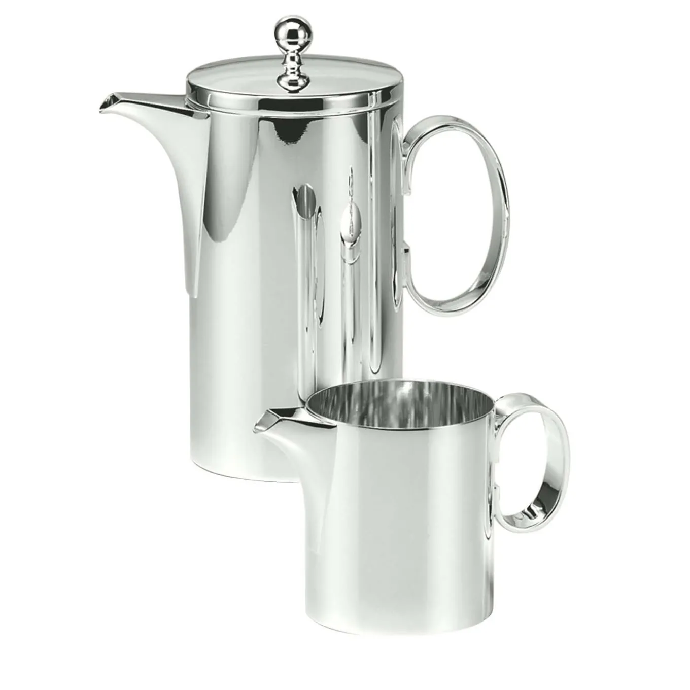 Elegant and stylish, this silver-plated teapot and milk jug set will add a refined accent to any tableware collection. The 12-person teapot (17 cm) has a capacity of 1 liter and features a cylindrical silhouette with an oval handle and an elegant elongated spout. The accompanying milk jug (9 cm diameter) has a 0.4 L capacity and matches the teapot’s sleek lines.