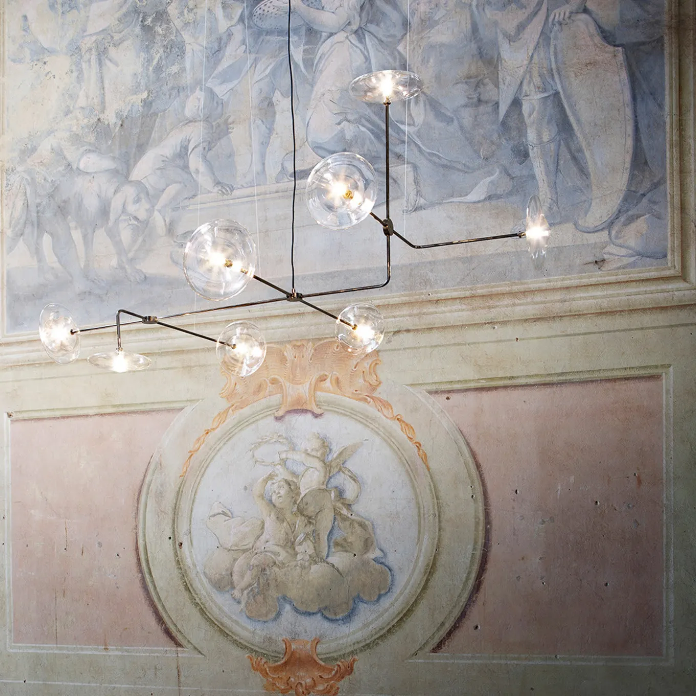 In this exquisite chandelier, industrial influences merge with the effortless charm of unobstructed lighting effects. Its clean frame in polished, chromed black metal comprises eight arms, each supporting a spinning top-like diffuser in borosilicate glass and hosting a G4 lightbulb (not included). Apt for any modern or eclectic setting, the design features diffusers in different diameters (Ø16cm and Ø21cm), please contact the Concierge for details.
