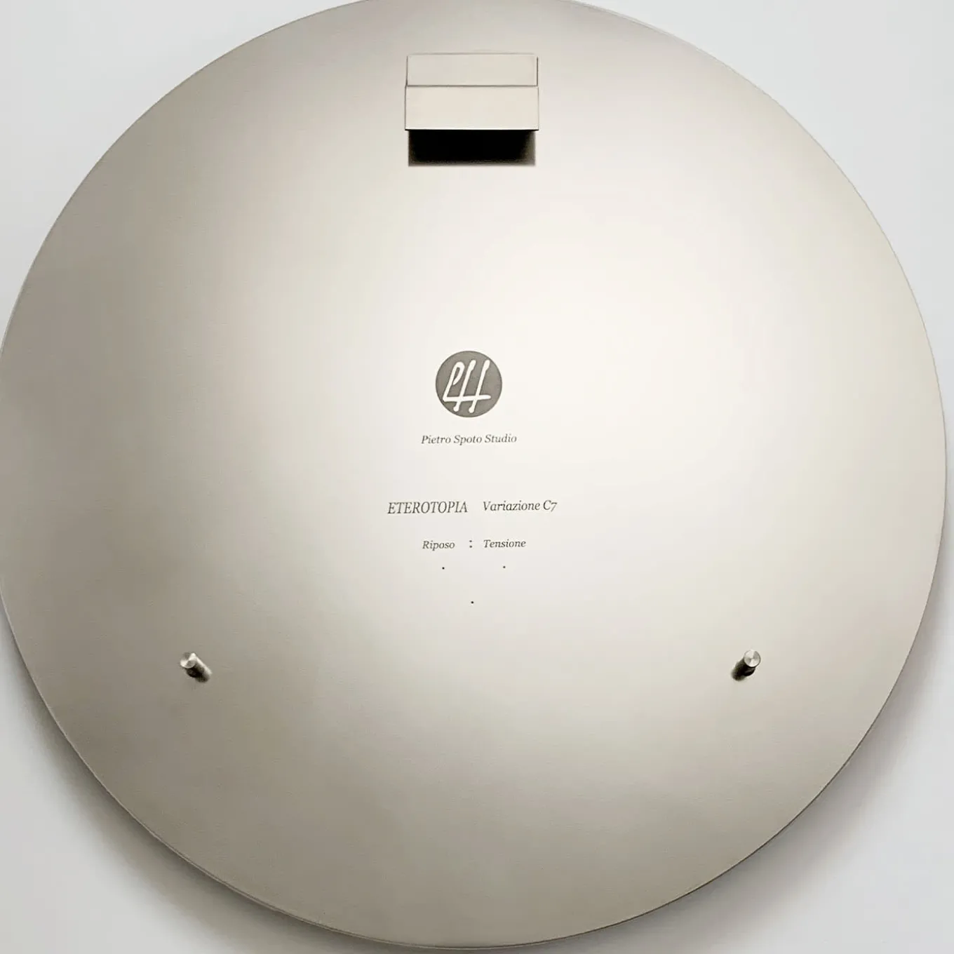 Fashioned of eggshell-finished nickel silver, this stunning decorative disk flaunts a mesmerizing blotched motif obtained with reagents that create contrasting hues seemingly resulting from an extraction gesture. The sculptural approach behind the piece reflects the philosophical concept of heterotopia, developed by Michel Foucault in the 1960s. Each piece is handmade and unrepeatable.