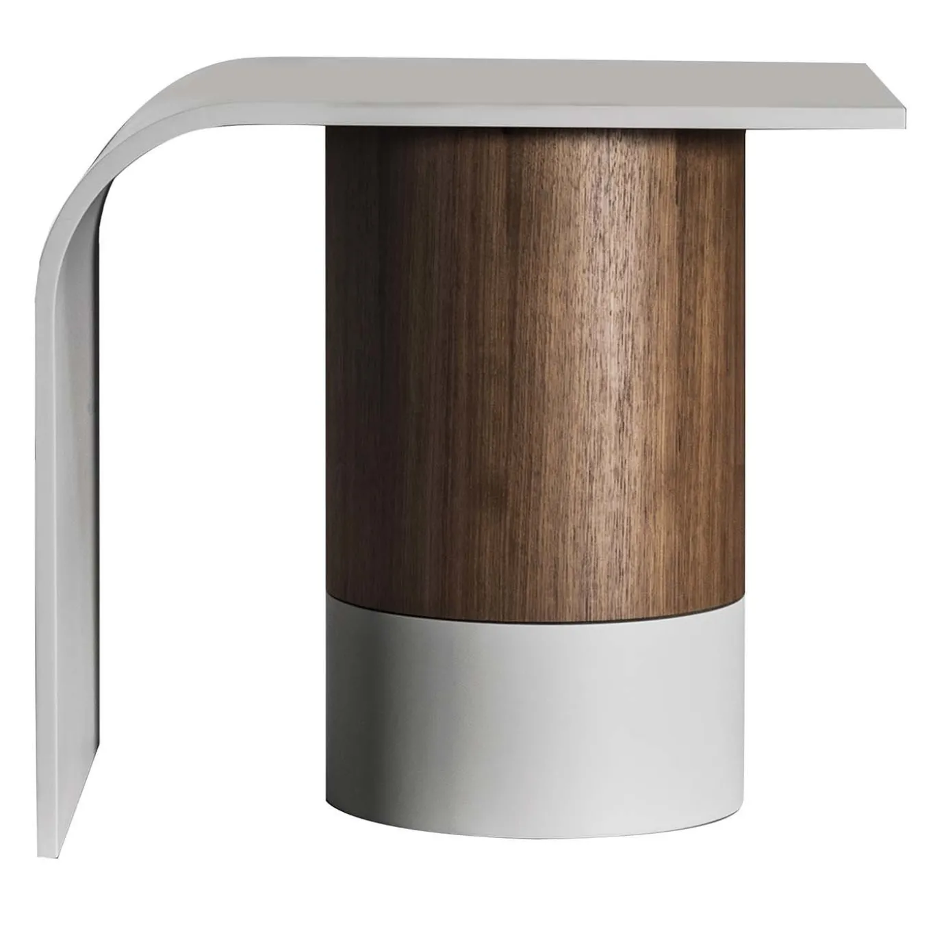 This stunning side table is an exercise in modernist sophistication. Its structure is entirely crafted of Canaletto walnut with a matte finish. It comprises a central cylindrical base on which the top curves, extending to the floor. These exquisite details are highlighted with a light gray matte color for a striking effect.