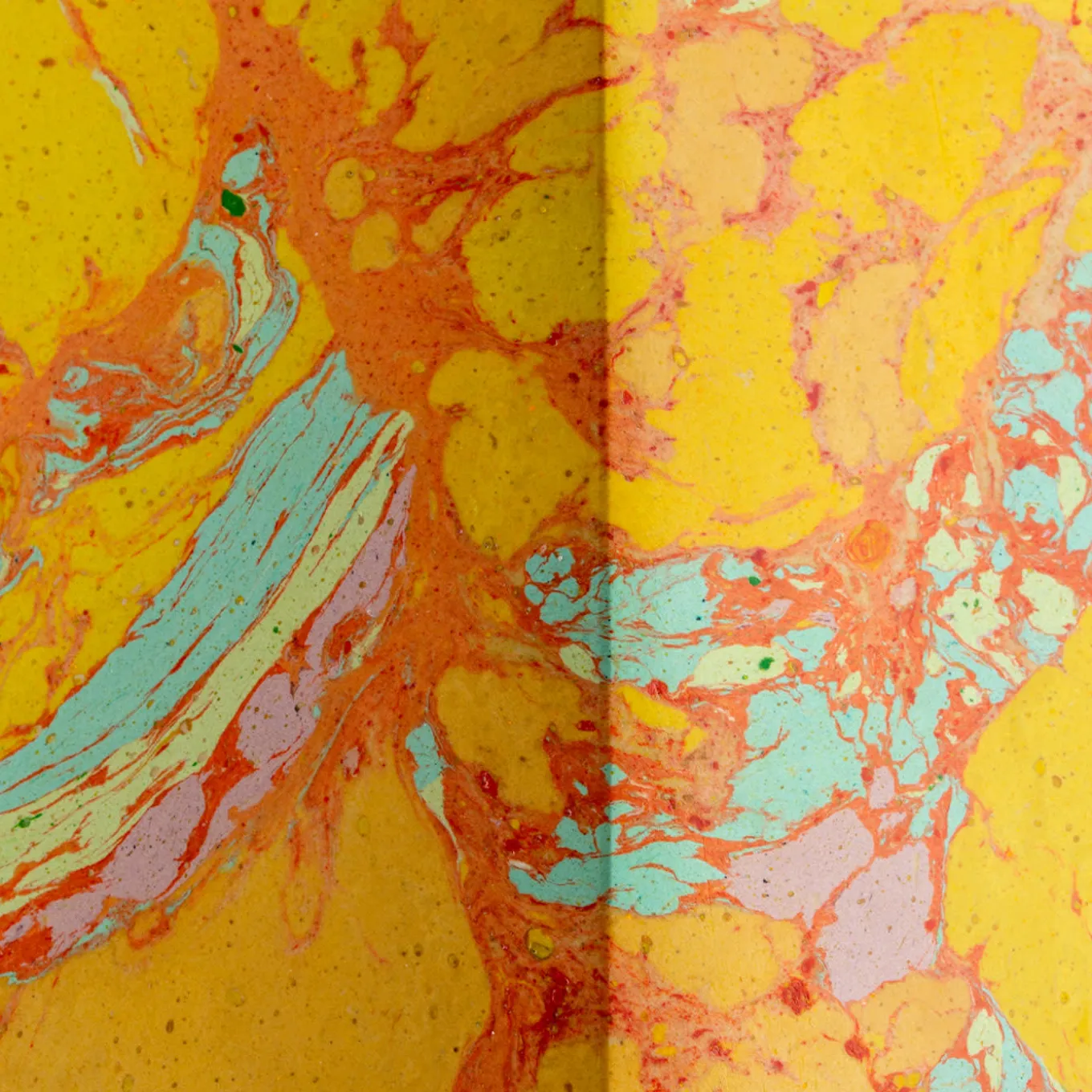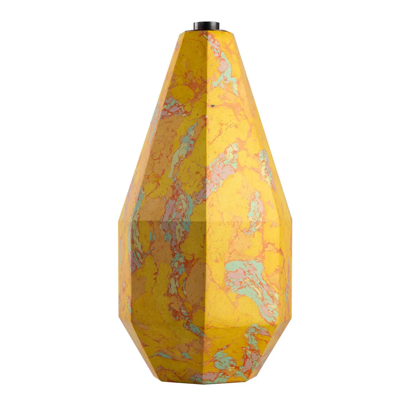 Octagonal base candelabra made of Scagliola Carpigiana. Worked with glue and natural pigments, the plaster is shaped to imitate the marble features. The candle seat is made of silver-plated brass with a diameter of 3 cm. The patterned texture is characterised by a deep yellow with orange veins, interspersed with light blue and pink spots.