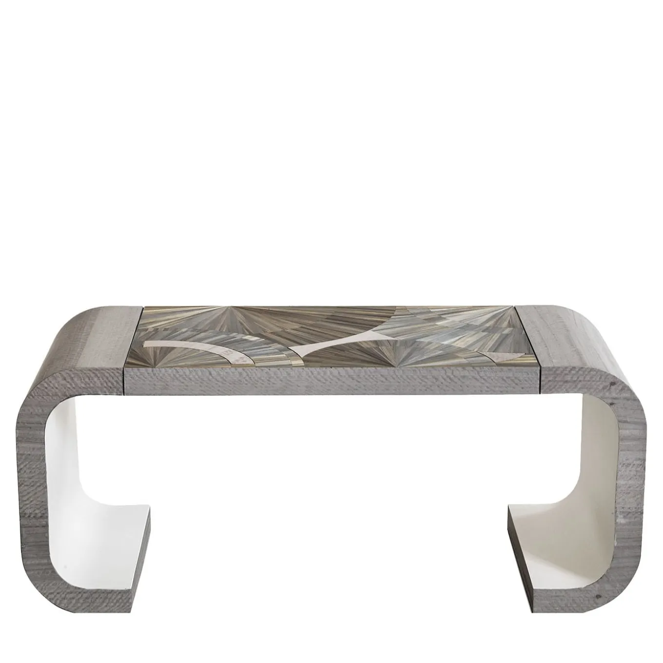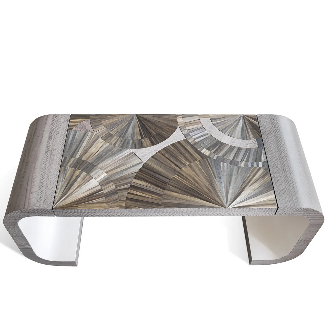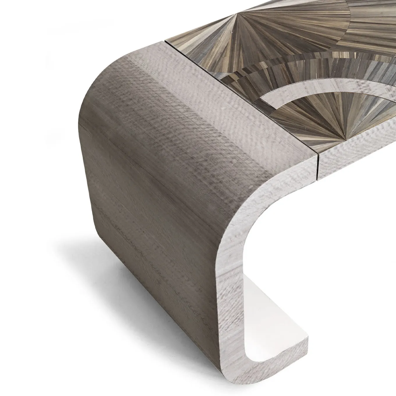 The modern side table showcases the mesmerizing beauty of frisè eucalyptus wood, gracefully complemented by intricate straw inlays, adding a touch of artistry to its design.