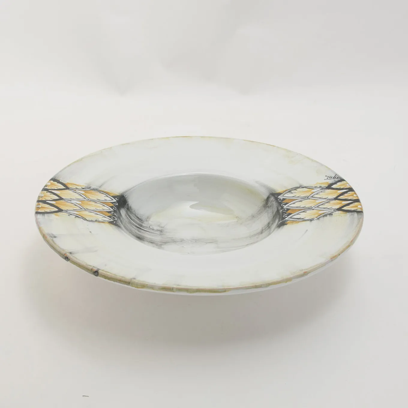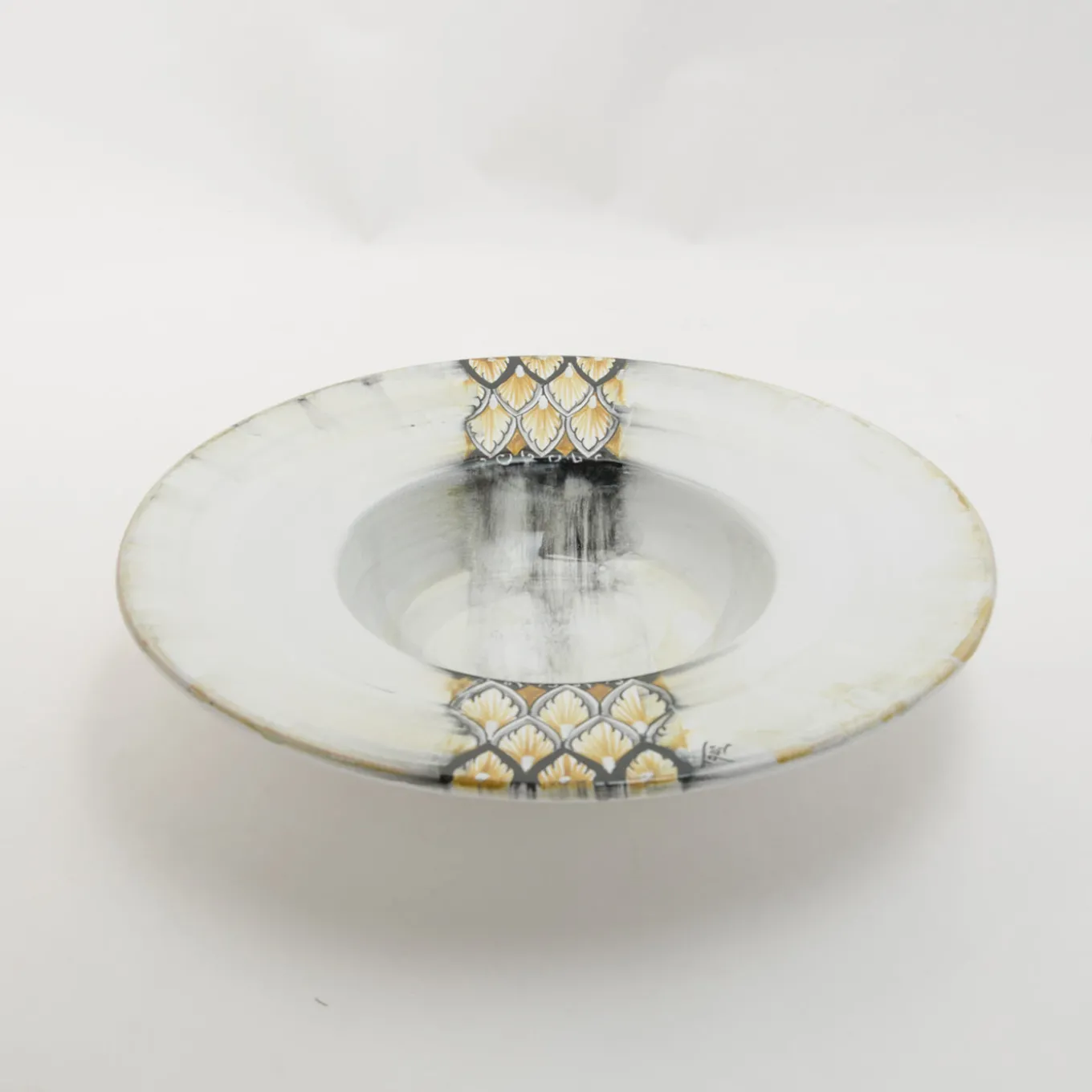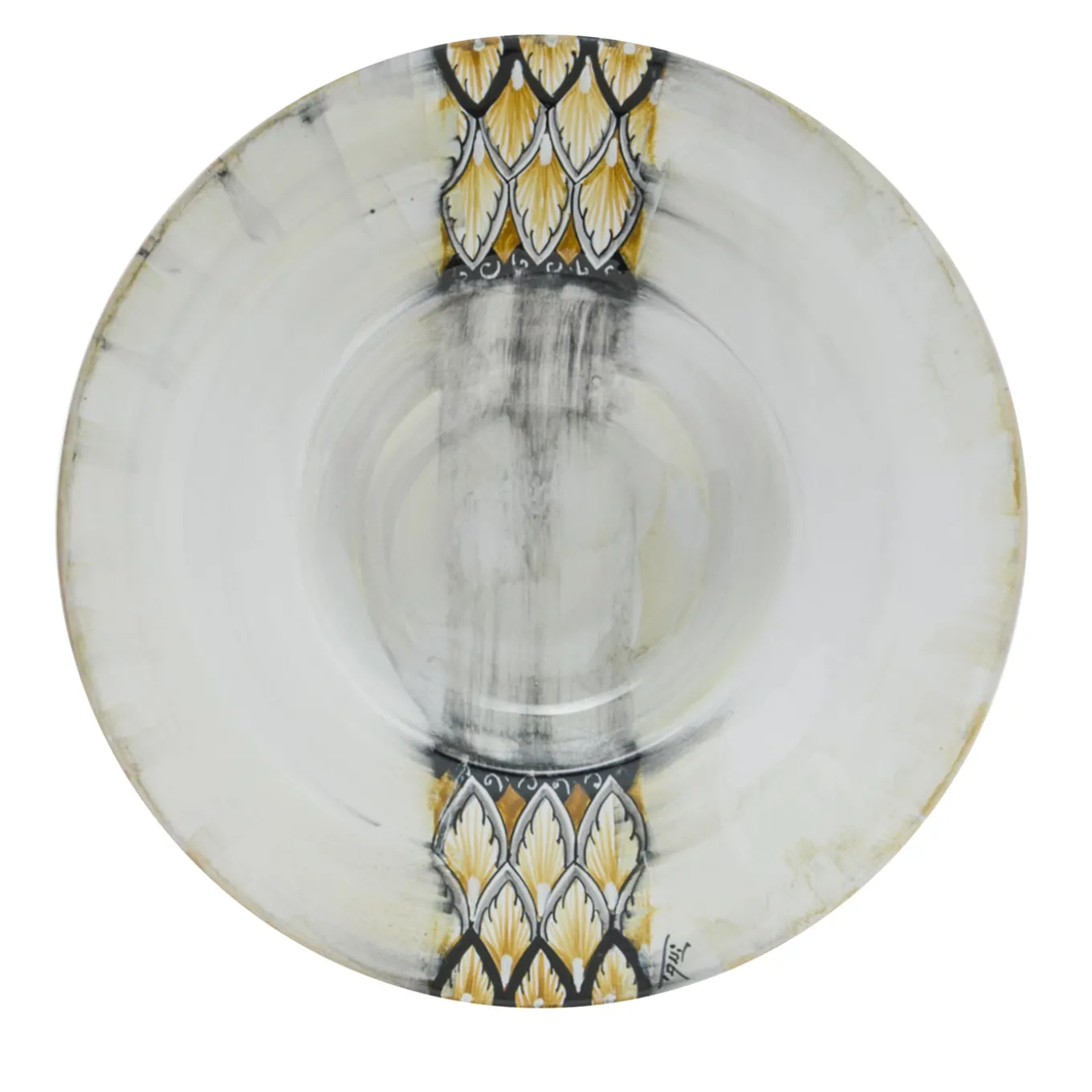 This 32 cm soup plate showcases a striking design with bold black stripes enriched by intricate golden-yellow accents, set against a soft white backdrop. Its generous size and shallow profile make it perfect for serving soups, while the elegant decoration adds a sophisticated touch to any table setting.
