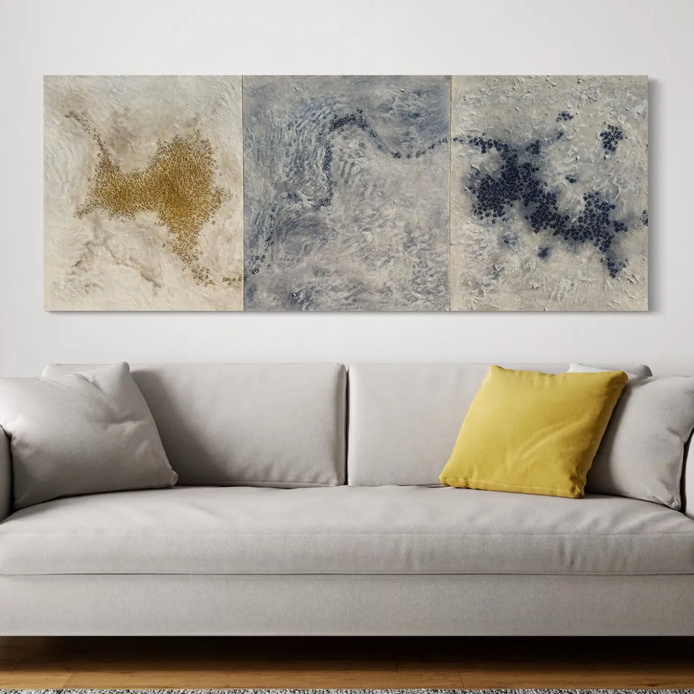 “Evoluzione” explores evolution as an unstoppable journey, represented in three distinct panels featuring diverse textures and hues. Each segment is crafted with a unique blend of resin, sand, and binders, skillfully modeled with varying raised mosaic or pixel elements. The layered colors and tactile surface emphasize the dynamic progression and transformation intrinsic to the artwork. A certificate of authenticity is included. One-of-a-kind piece.