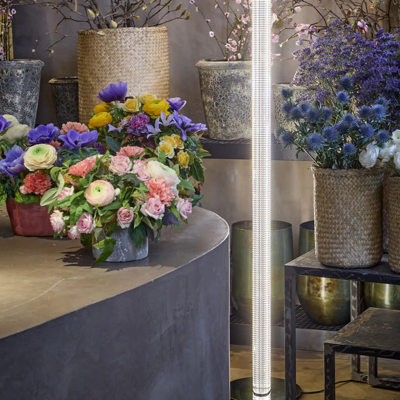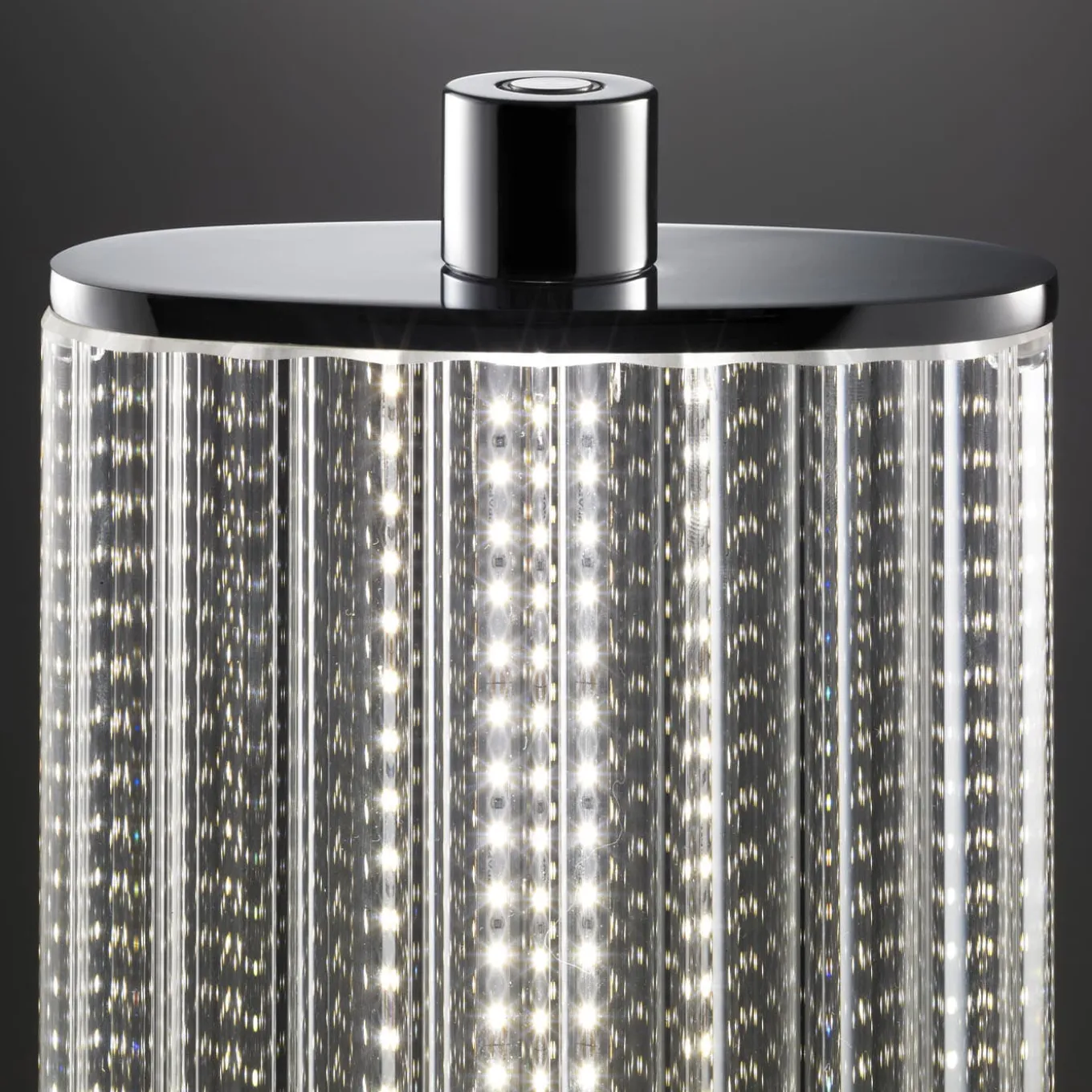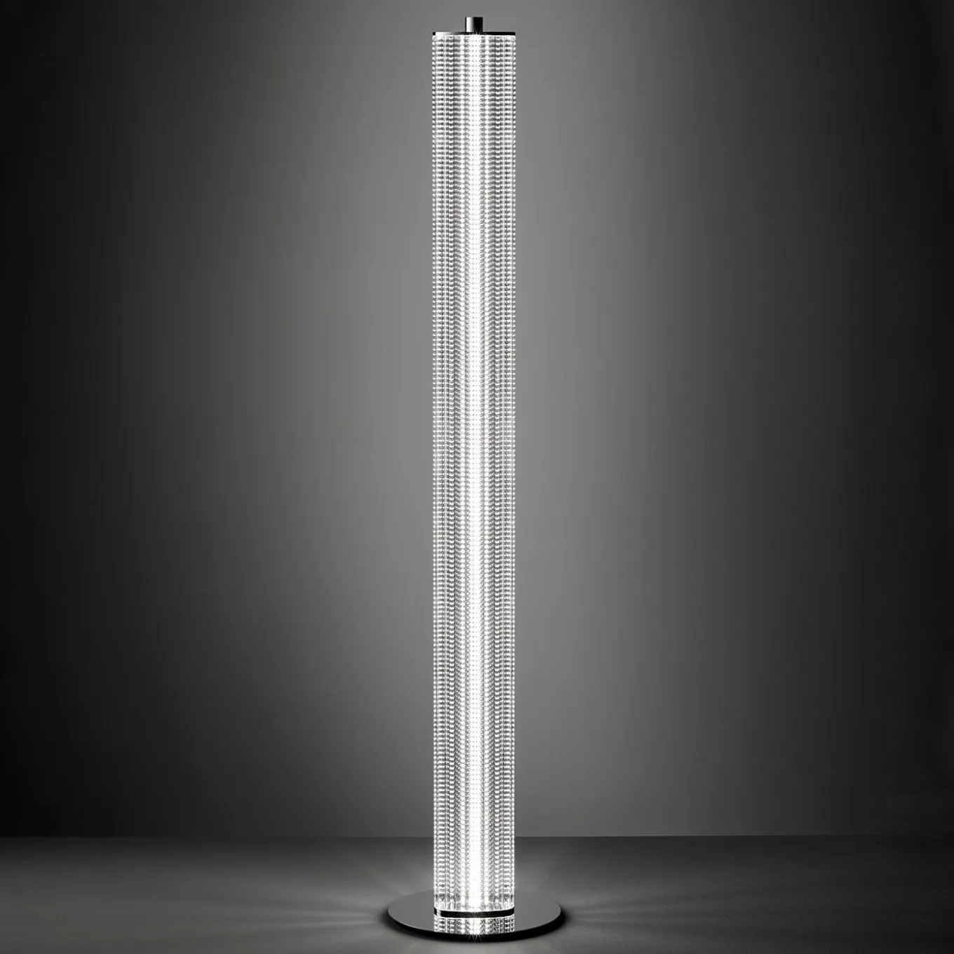 Sculptural and elegant, this floor lamp features LED strips emitting dimmable light hosted within a body of clear, extruded, and fluted glass that multiplies the reflections and indeed tempers its impact. Please contact the Concierge for the sandblasted glass version allowing for an even more suffused output.