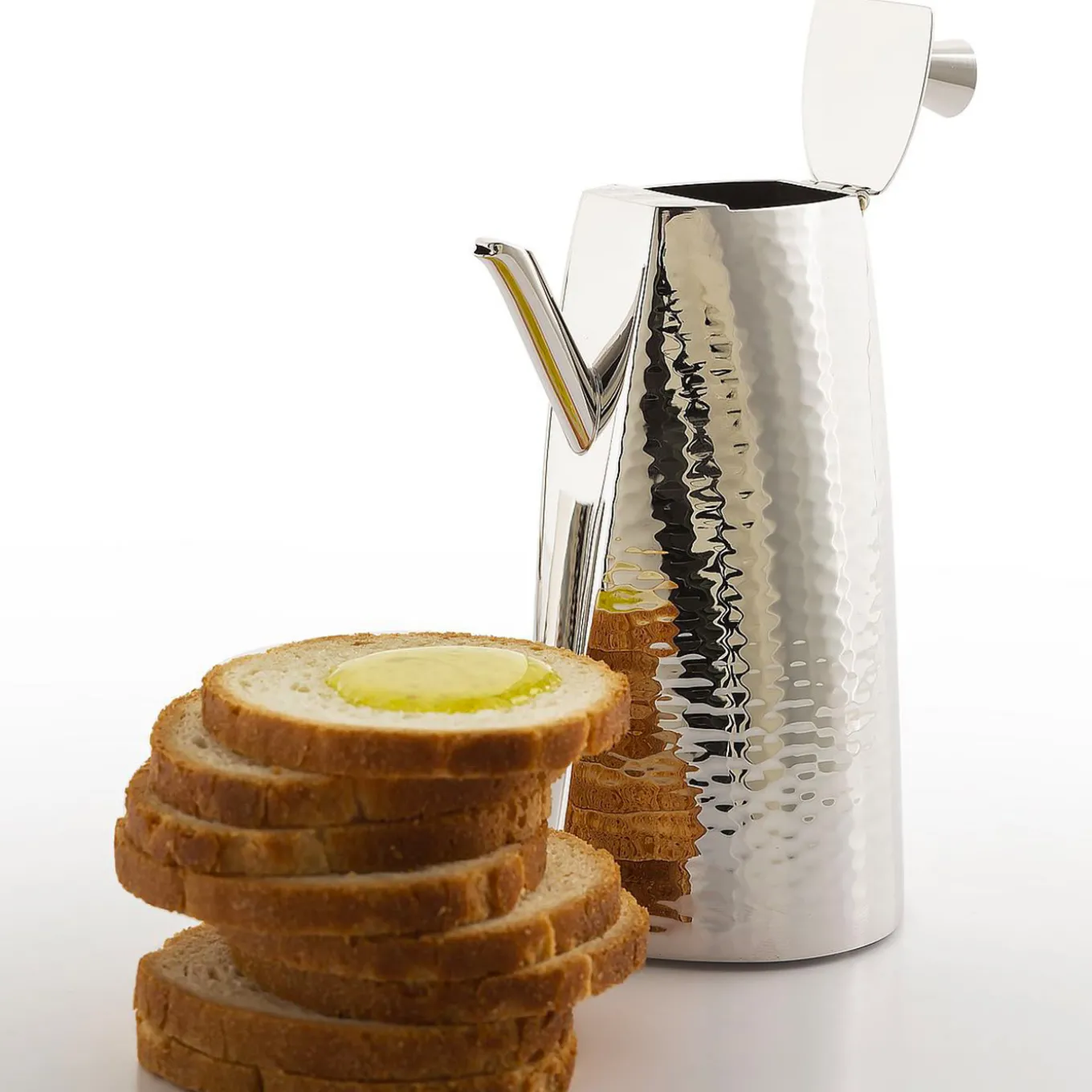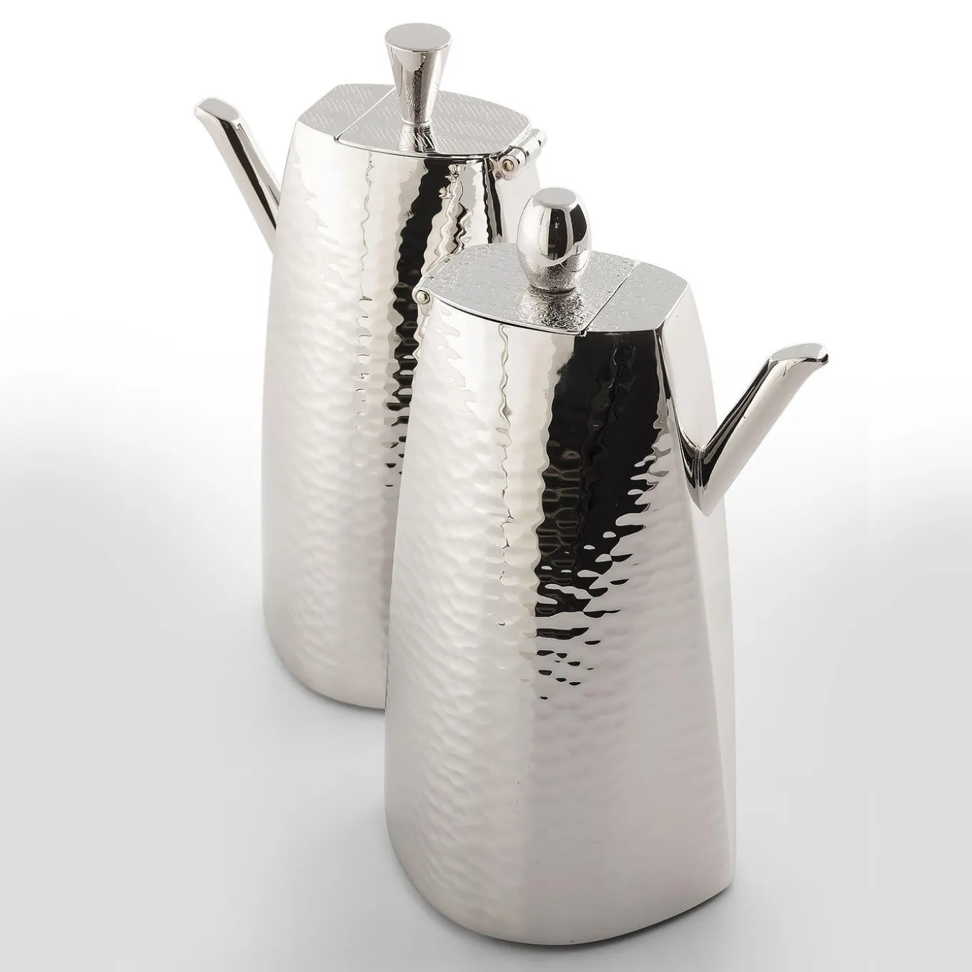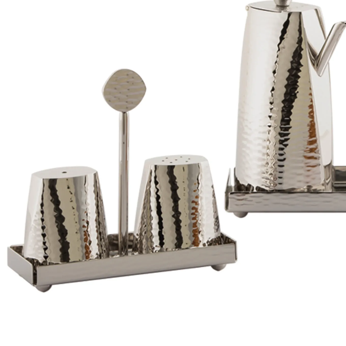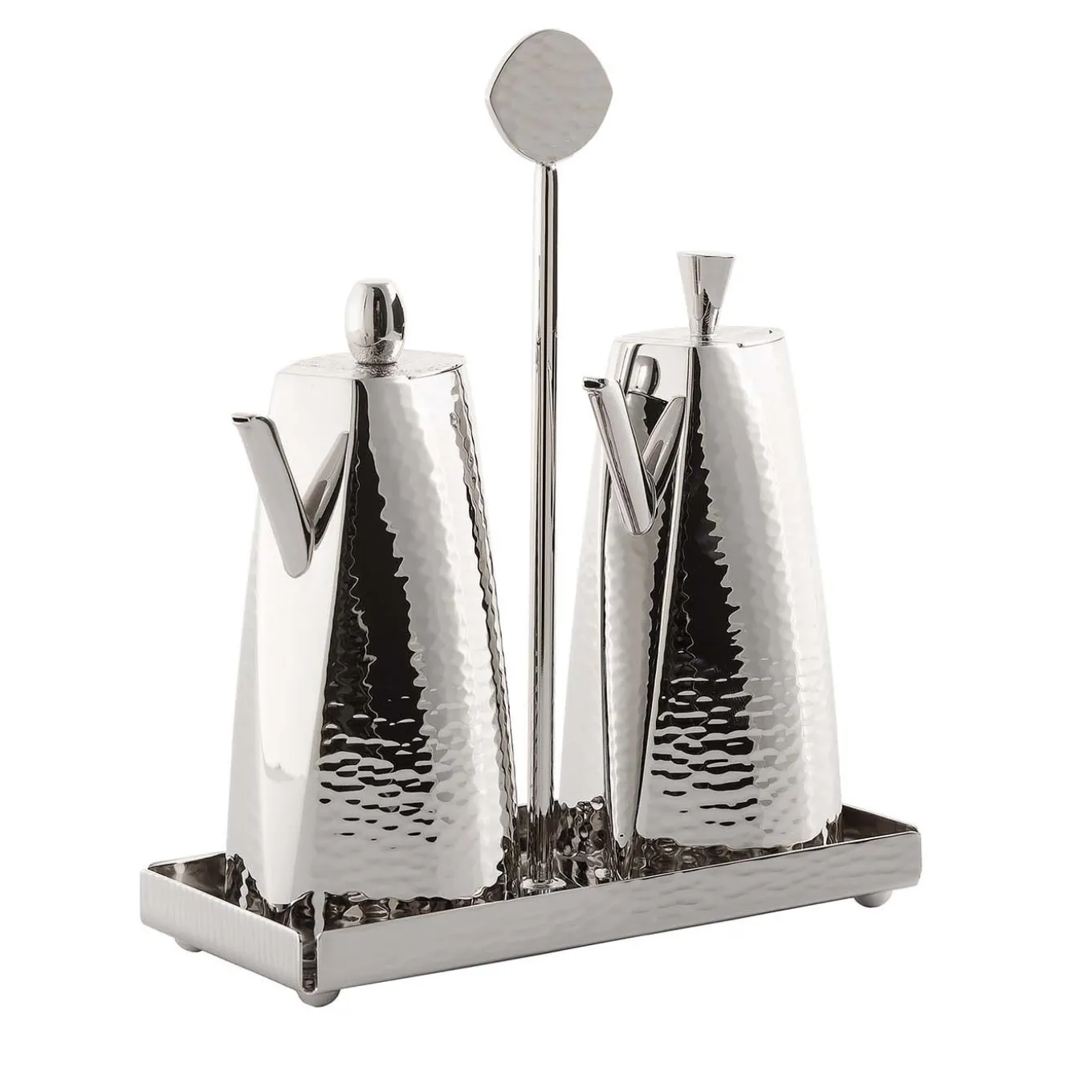 This sophisticated and modern oil and vinegar set is a fine addition to any dining table. Four rounded feet are welded to the bottom of a hand-folded tray with hammering along the outer rim. The central stem is capped by a textured ovoid handle. The hammering technique contributes both to the finish and the shape of the two containers. Two different knobs, suggestive of the letters O and V for Oil and Vinegar, differentiate the two lids.