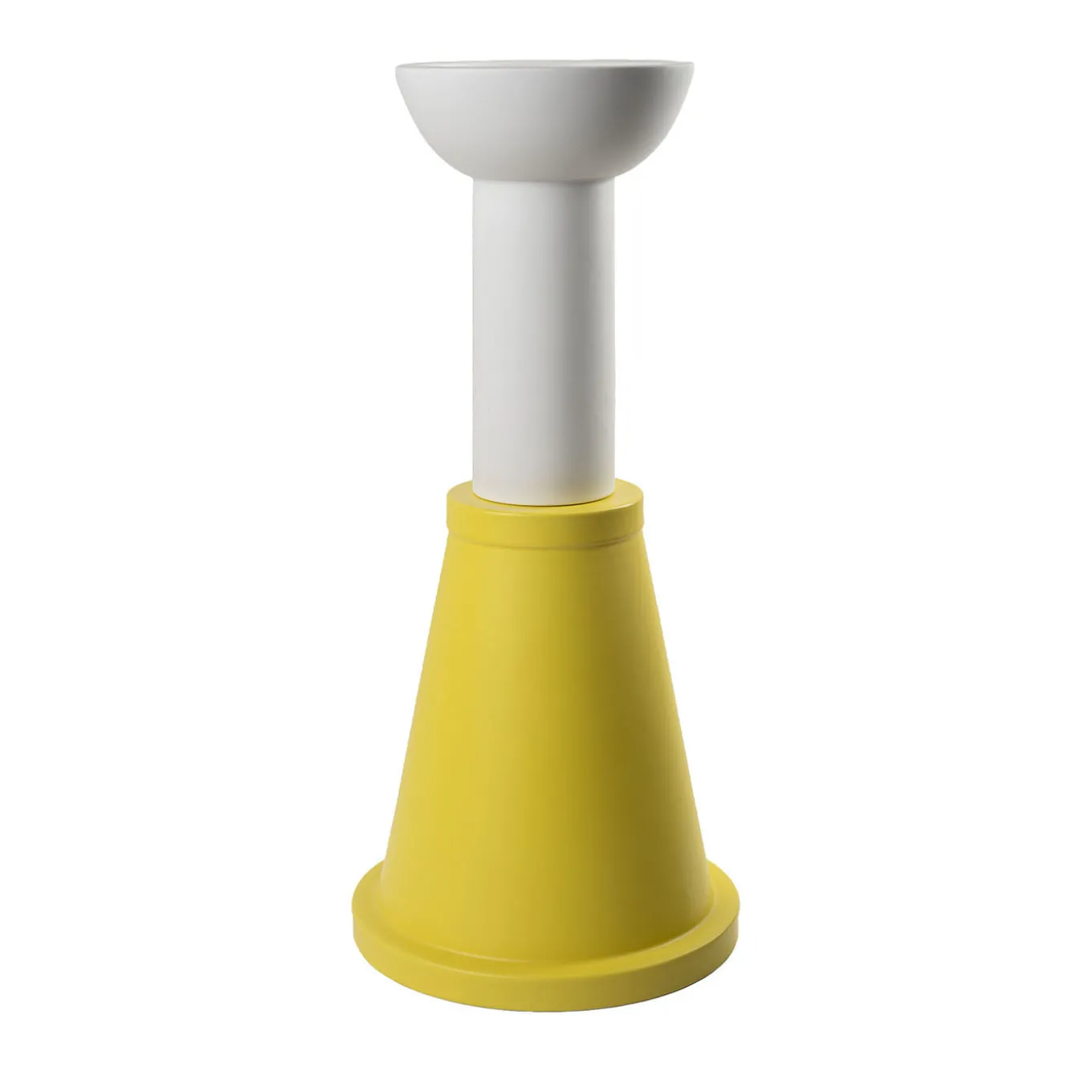 Standing on a yellow truncated cone, a white cylinder with a semicircular top completes this stunning ceramic sculpture by Natalie Du Pasquier, creating an artistic focal point in any modern interior. These bold geometric volumes are shaped on a lathe and finished with a matte glaze to enhance the magnificent chromatic effect. This splendid artistic object makes an exclusive gift for a collector or a present to celebrate a momentous occasion.